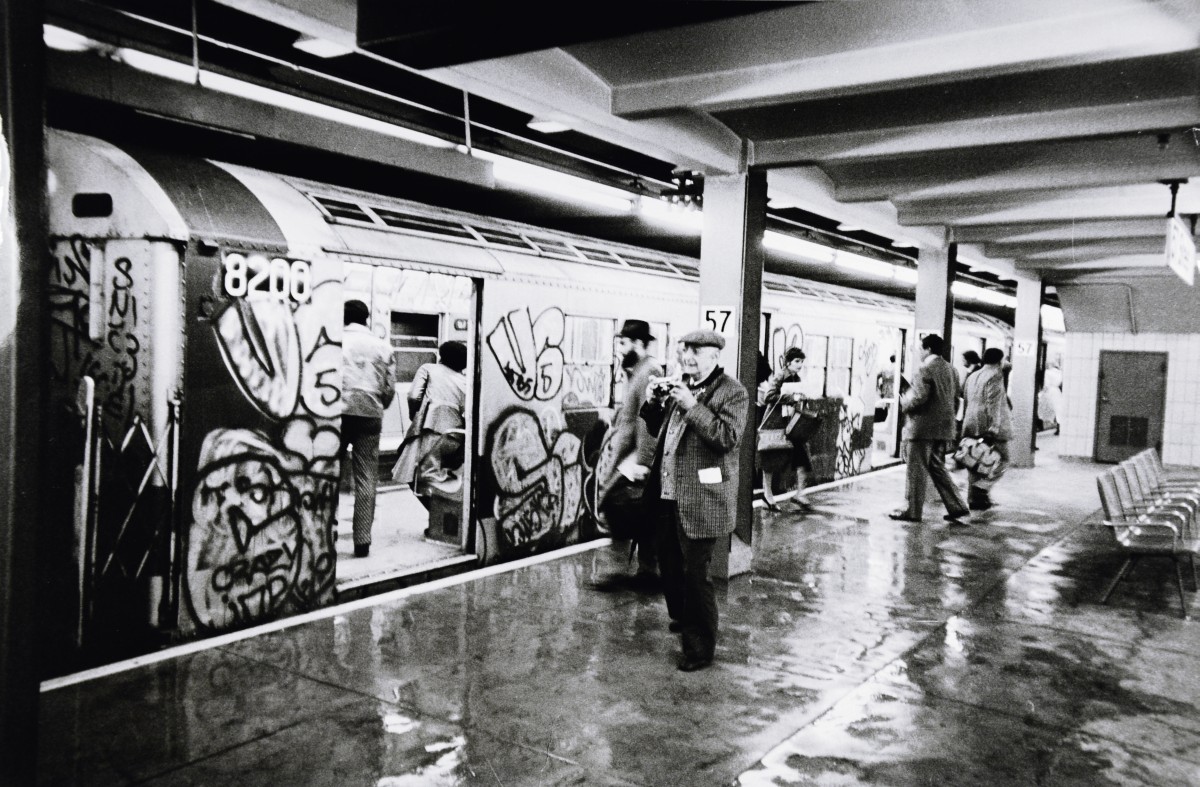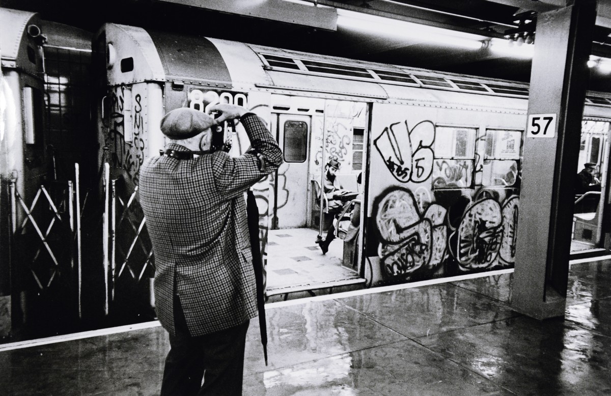 on voit Brassaï entrant dans le métro, arrêté à la station 57th street, photographiant des graffiti sur