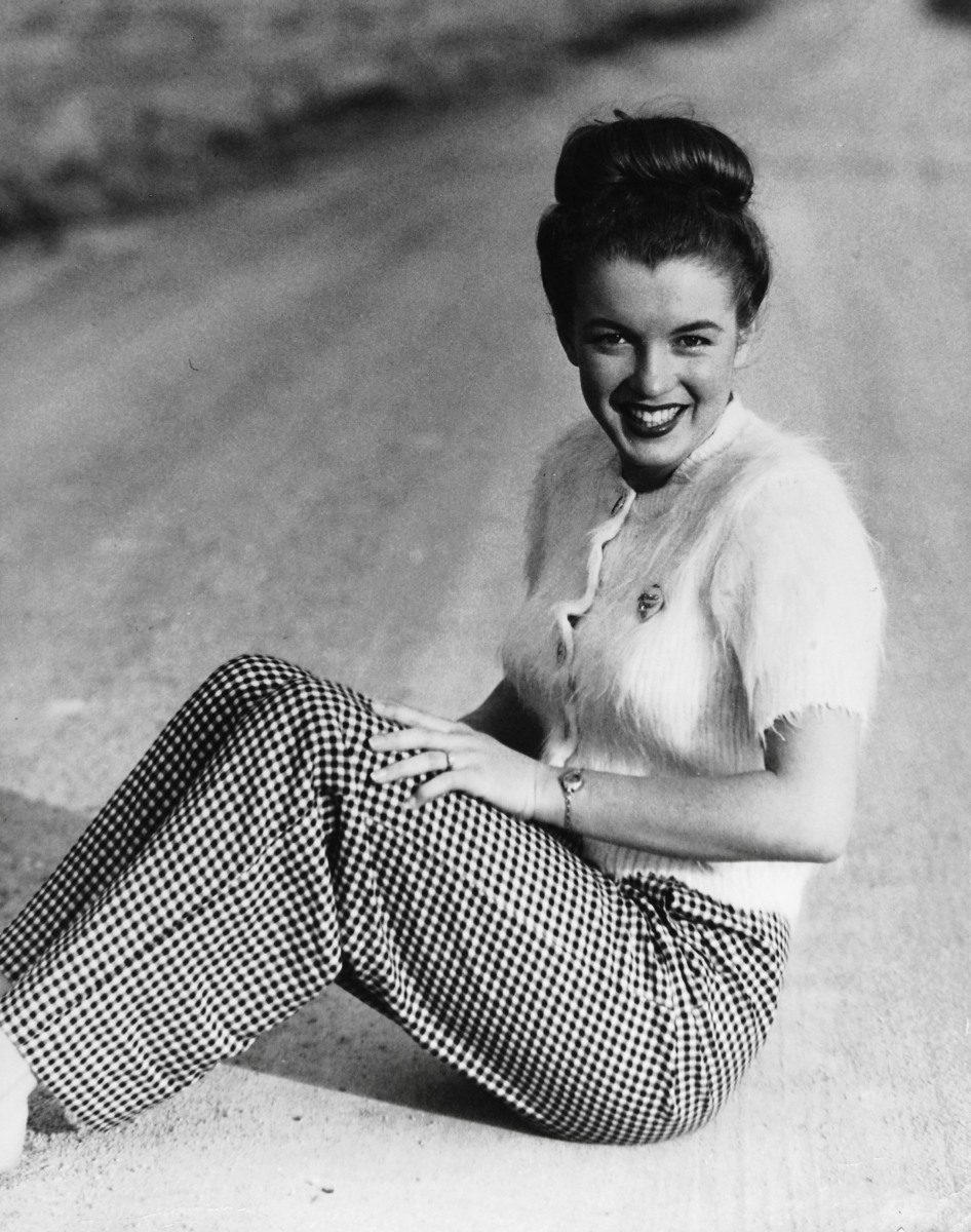 Joli portrait émouvant de Norma Jean Baker (ou Mortenson) à 19 ans, encore brune et frisée, à l'époque du tournage de son premier film pour l'agence Blue Book. Pantalon vichy, pull angora et gros chignon elle incarne l'insouciance de l'après -guerre. Elle porte encore l'alliance de son mariage