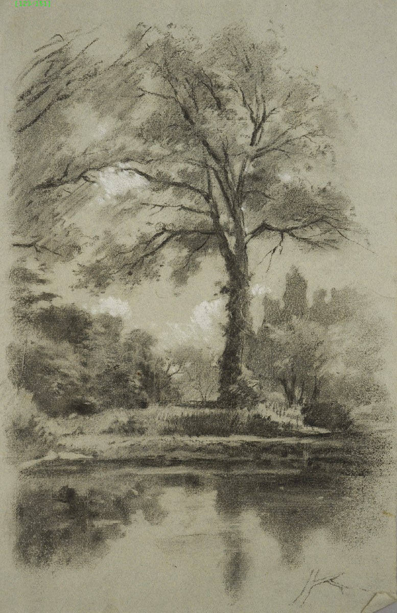 -École française du XIXème. Paysage. Crayon gras et craie blanche. 47 x 30 cm.