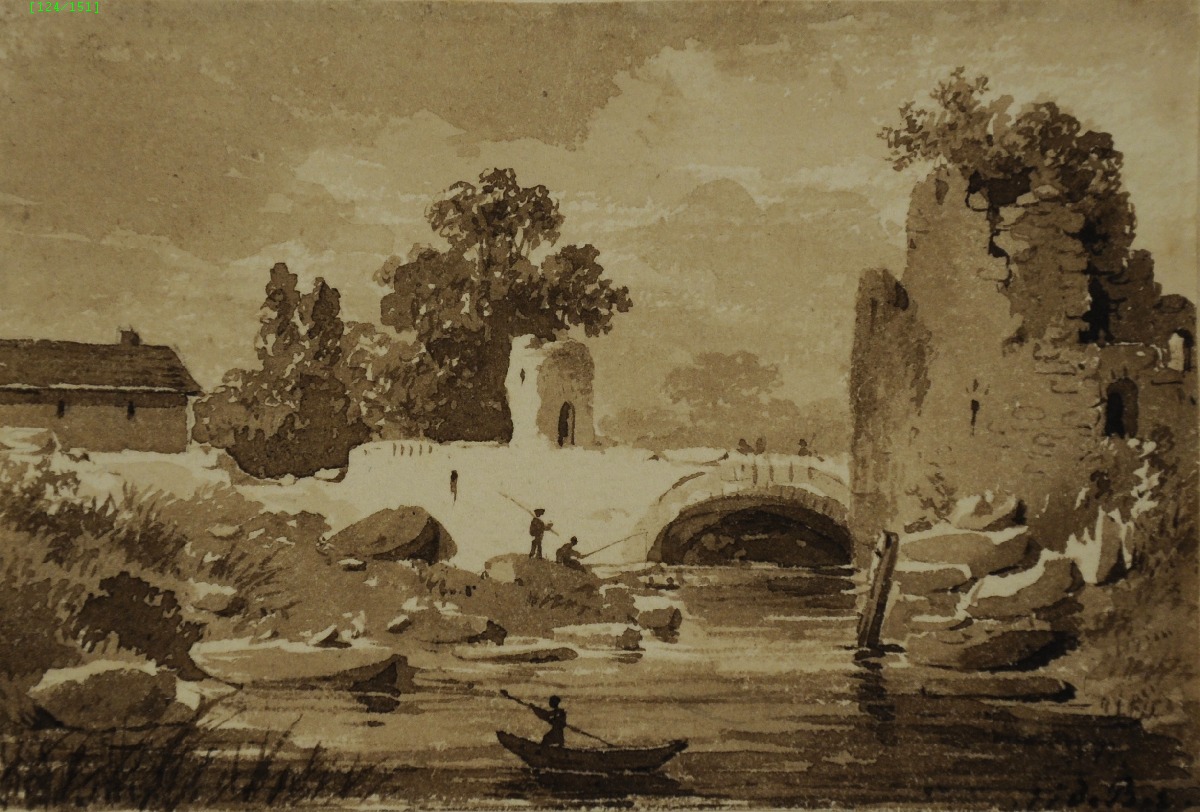 -BASTIÉ de BEZ Jean Joseph (Bastier de Villars de Bez d'Arre) (1780-c.1845). Paysage animé. Encre brune et lavis. Contrecollé sur une feuille. Signé en bas à droite. 6,5 x 9,5 cm.