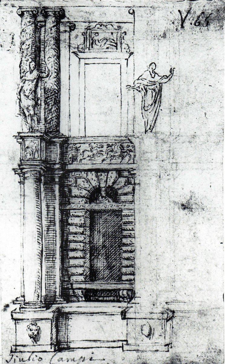 Milan, n.c. 467) présentent au niveau du premier étage des statues dont ce dessin est manifestement une étude de détail et que les spécialistes de Campi s'accordent à dater entre 1541 et 1547.