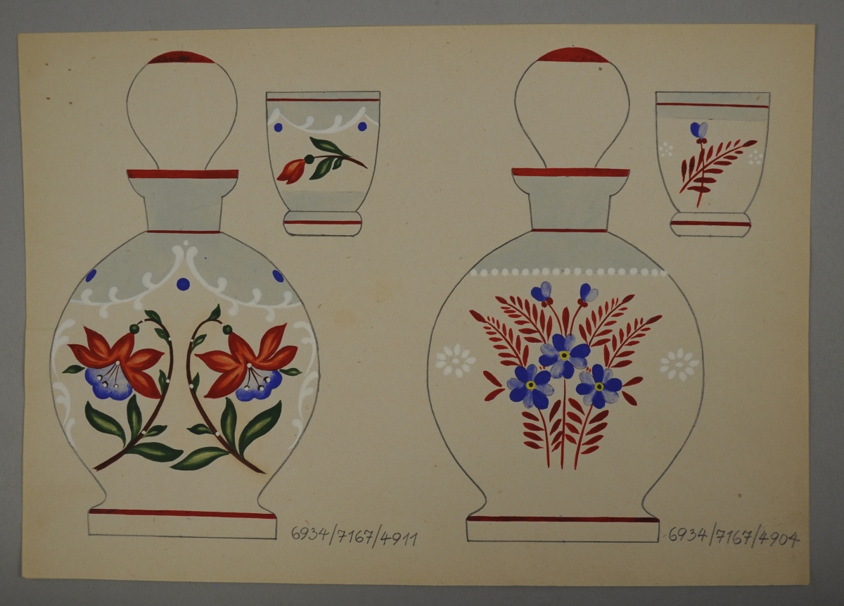 26 dessins avec rehauts d'aquarelle et de gouache de projets de verreries décorées. Certaines portent le cachet "Bor Glassworks National Corp HRDINA PRACHEN Czechoslovakia".