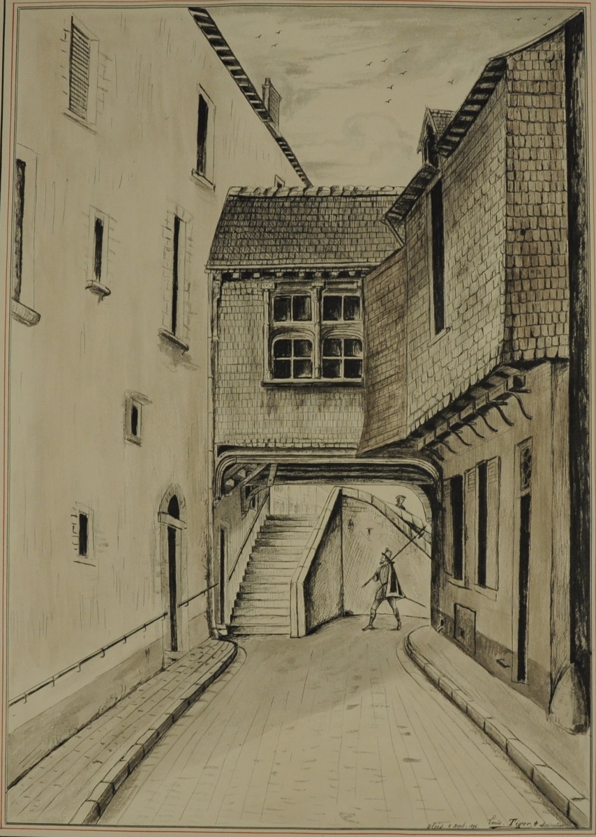 -TIGER Louis. Vue d'une ruelle et Vue de la Tour d'Argent. 2 dessins à l'encre noire et lavis, datés 1896. 44 x 31 et 52 x 31 cm.