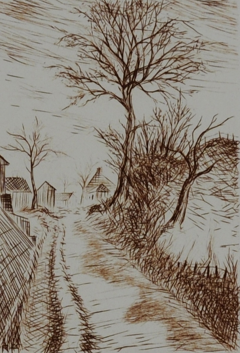 -EHRMANN Jean-Paul. 5 gravures au burin figurant des vues de villages, un vanneur et un hibou.