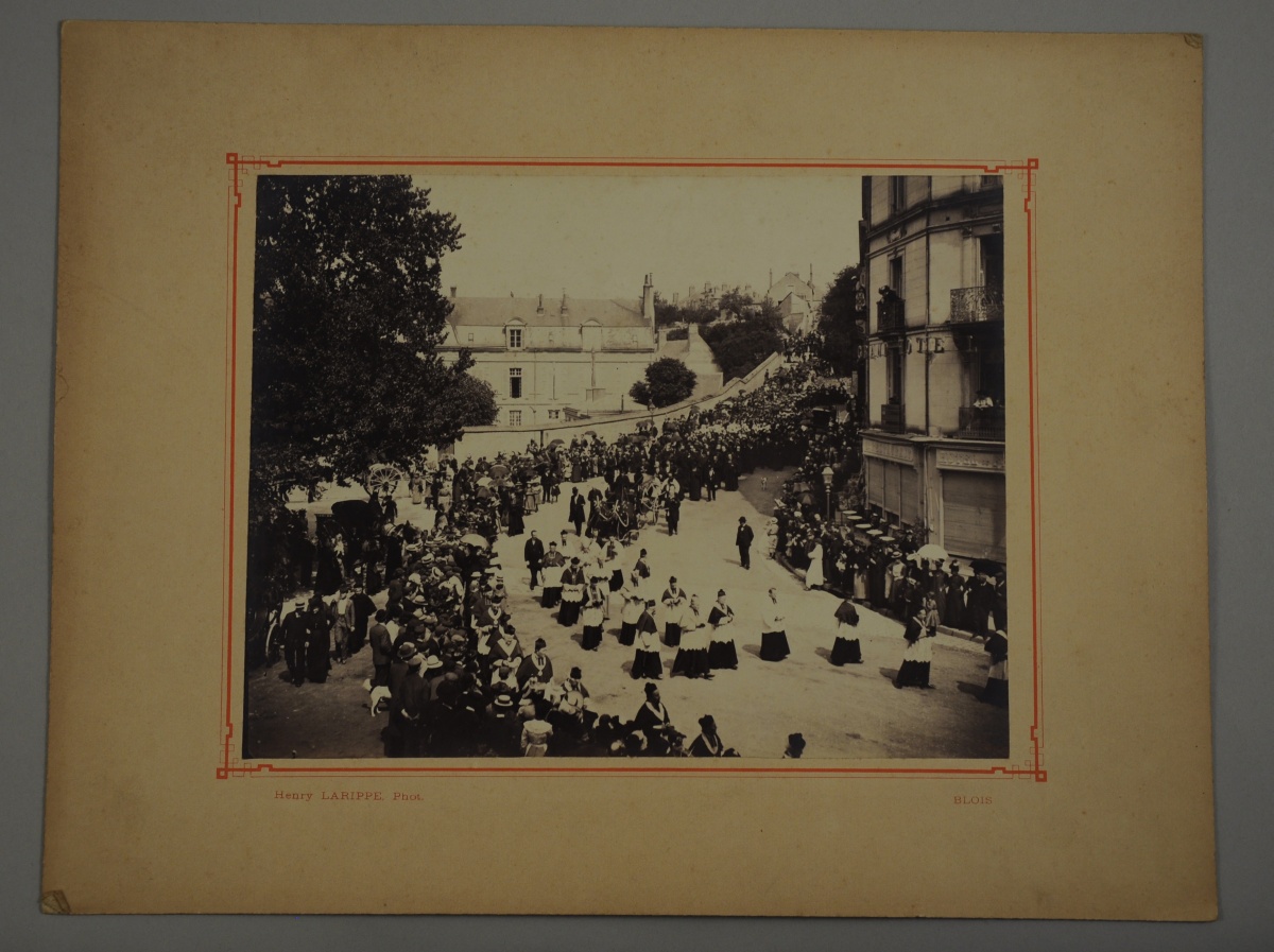 Réunion de 9 PHOTOGRAPHIES sur la ville de Blois, dont quatre clichés par Henry LARIPPE, pris vers 1900 à l'occasion d'un enterrement (17,5 x 23 cm).