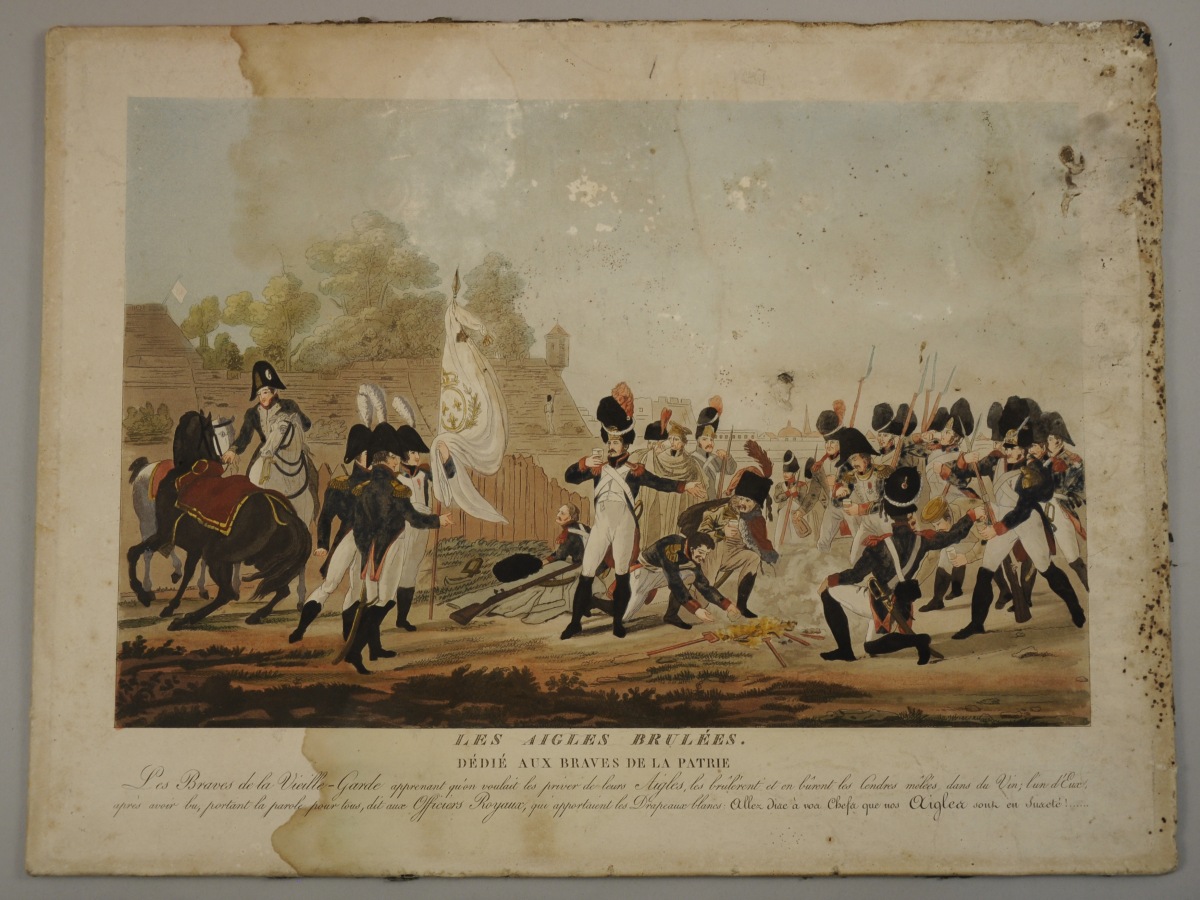 Gravure rehaussée d'aquarelle. Marouflée sur carton.
