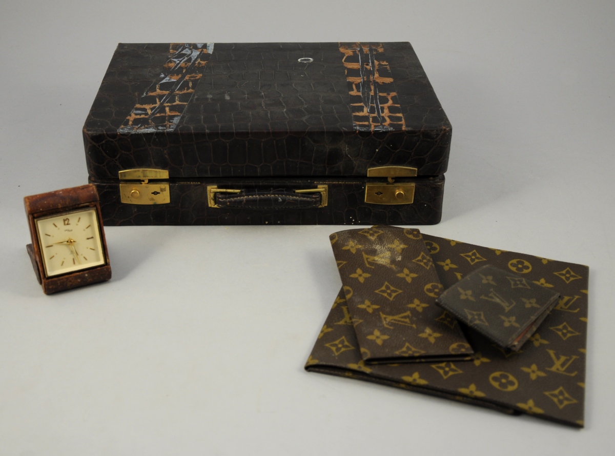 Joint: Réveil de voyage Imhof, dans un étui de cuir usé, et trois étuis Vuitton (état médiocre).