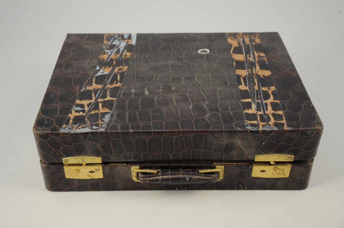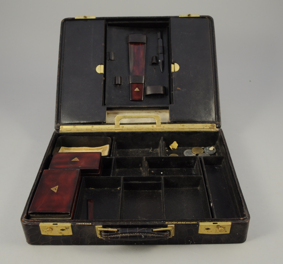 DUPONT - 8 bis rue Dieu à Paris. Mallette de voyage en cuir de serpent brun. Fermetures en cuivre. Intérieur compartimenté, avec quelques accessoires restants (chausse-pied et boîtes), laqués rouge. Poignée rétractable. Signée à droite, près du fermoir.