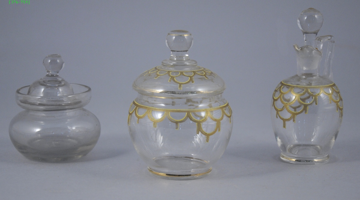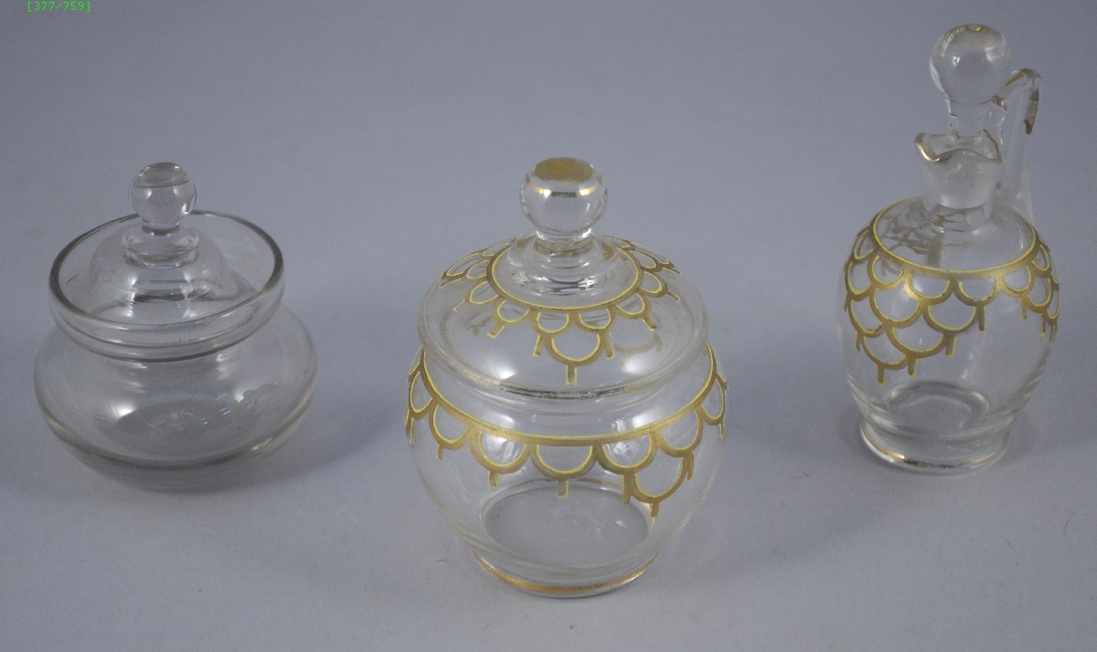 Partie de SERVICE VERRE D'EAU en demi-cristal soufflé comprenant un sucrier et un carafon à eau de mélisse, de forme pansue. Décor à l'or de motifs en écaille de poisson.