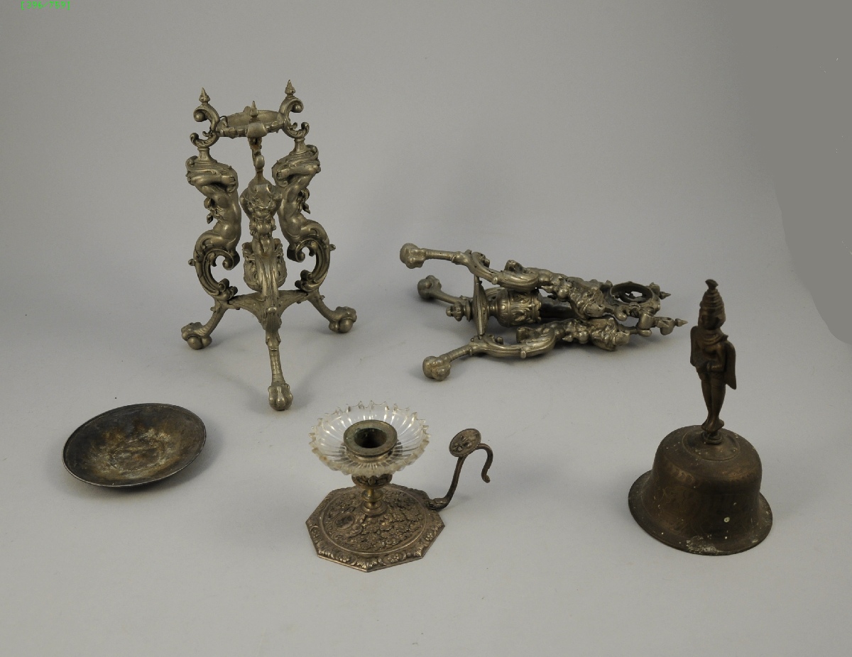 -CLOCHE en bronze, à décor ciselé d'éléphants passant. Poignée en forme de divinité hindoue. Diam. 10, Haut. 19 cm.