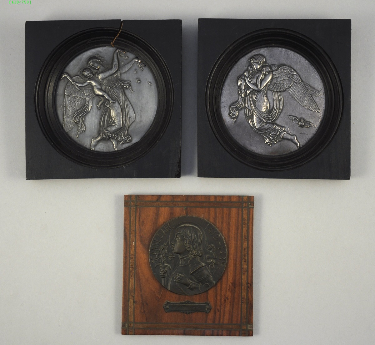 PAIRE de MÉDAILLONS circulaires en étain représentant pour l'un une figure ailée portant deux enfants accompagnés d'une chouette, et pour l'autre une figure ailée jetant des roses et portant un amour.