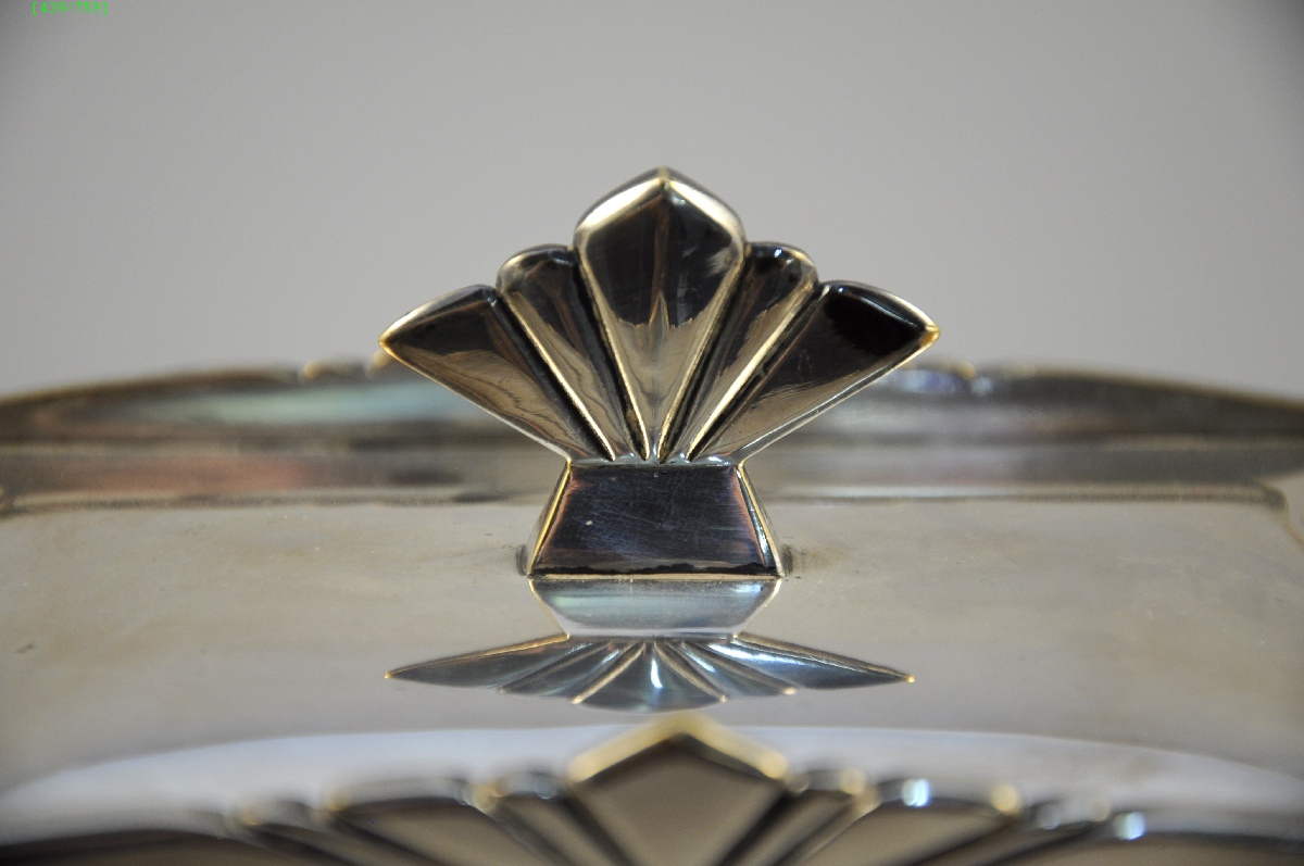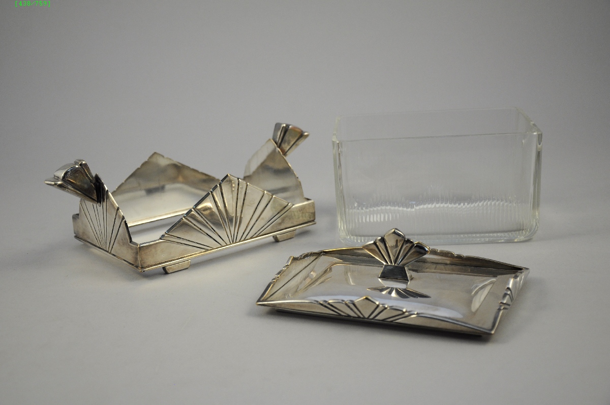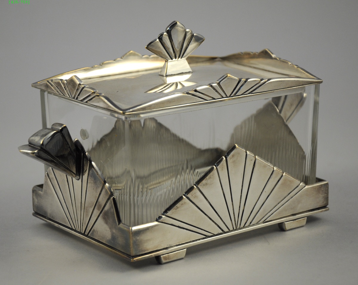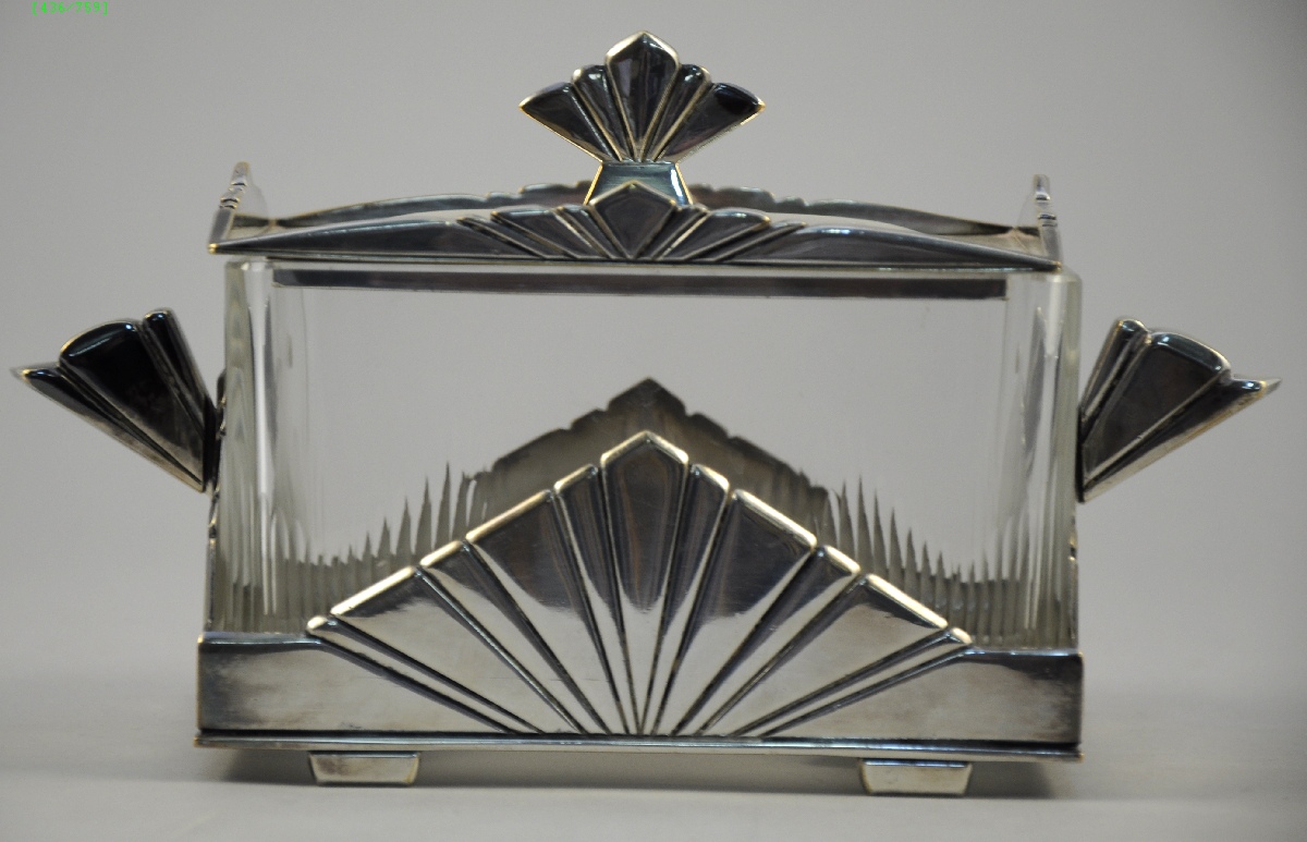 BOÎTE à BISCUITS de forme rectangulaire, en verre taillé à côtes. Monture, anses et couvercle de style géométrisé, en bronze argenté.