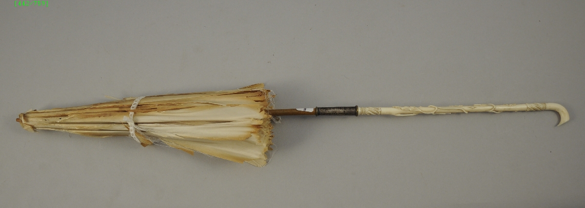 OMBRELLE à manche repliable en ivoire, sculpté de feuilles et de glands, entre deux bordures de godrons torses. Marquée La Vaissière Buisneau sur une bague de métal.