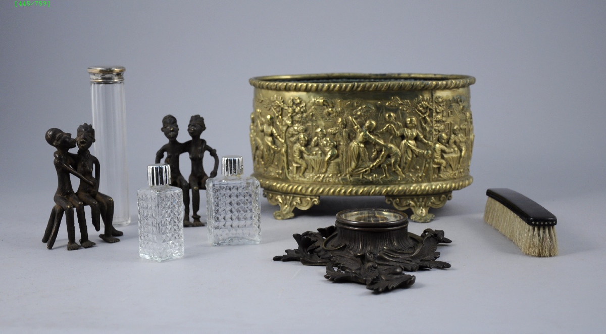 -Une JARDINIÈRE en laiton repoussé, à décor de scènes villageoises, reposant sur quatre petits pieds. Début XXe. Haut. 15, Larg. 25 cm.