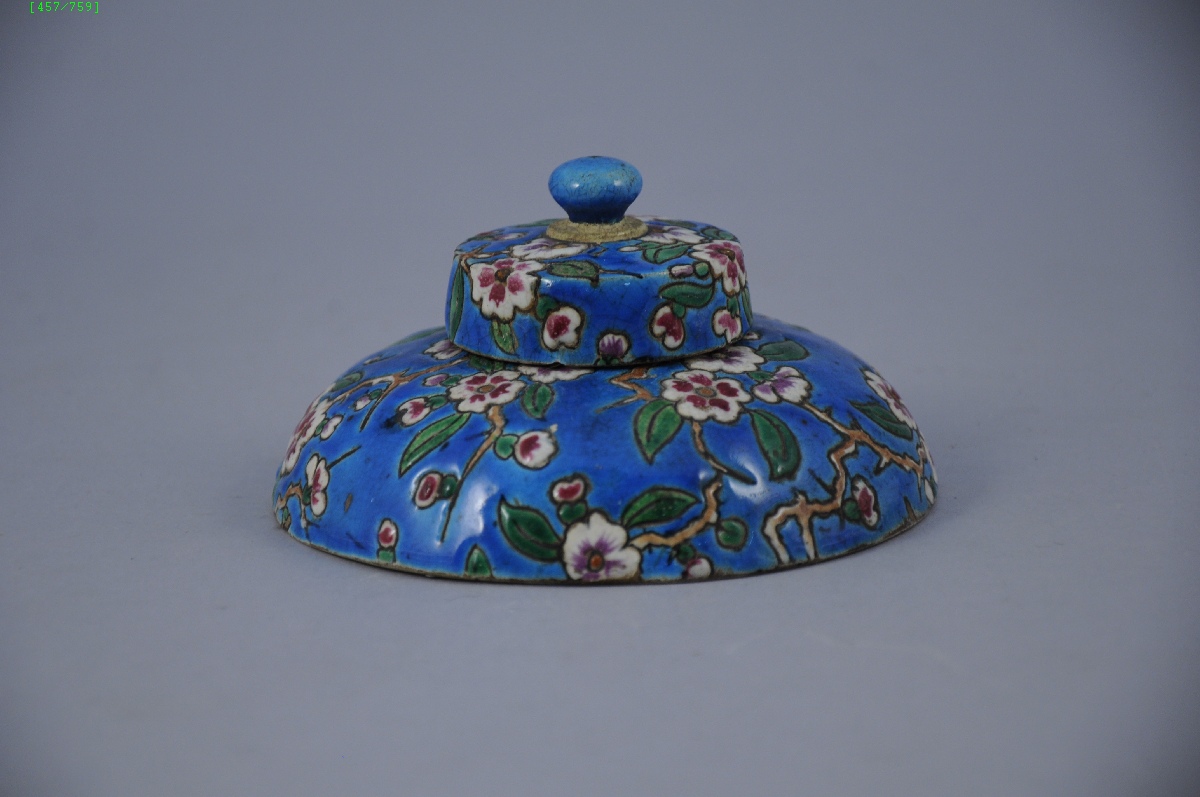 LONGWY. ENCRIER rond "presse-papier" avec couvercle, à décor d'émaux cloisonnés figurant des branches fleuries sur fond bleu.