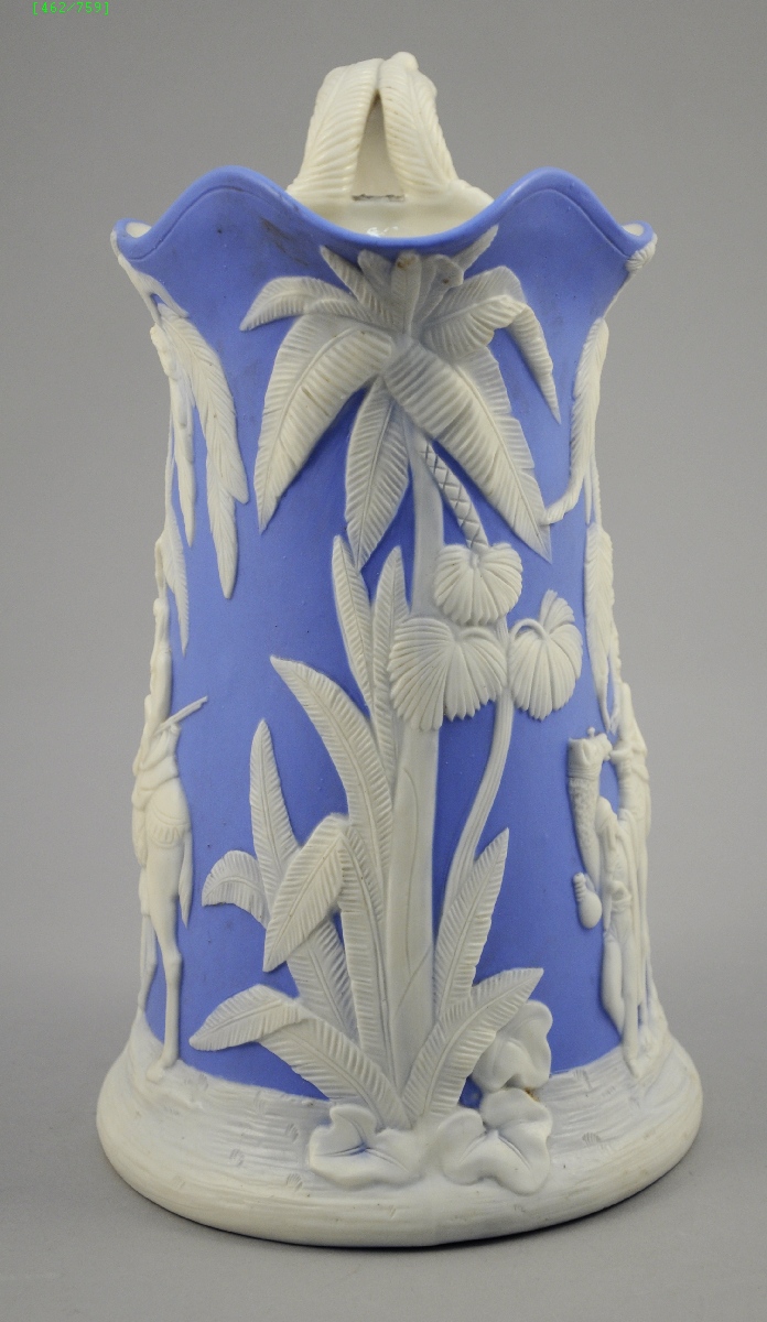 SAMUEL ALCOOCK & Co. Grand pichet en biscuit de porcelaine émaillé à l'intérieur, à décor en blanc sur fond bleu d'un personnage monté sur un dromadaire, sur fond de palmiers. Anse figurant des palmes.