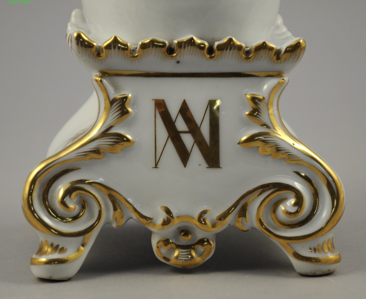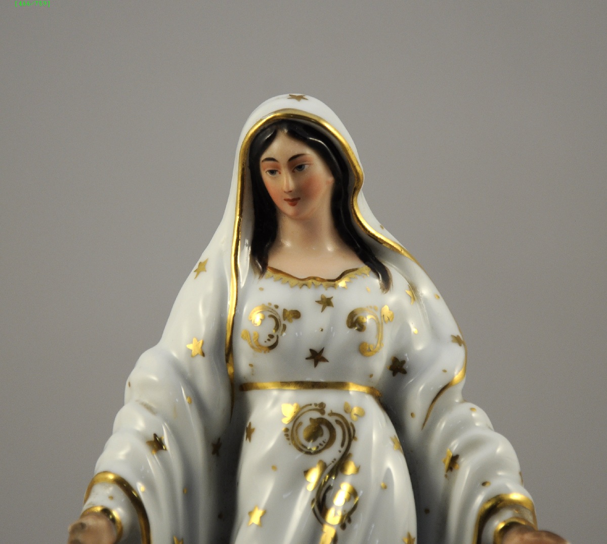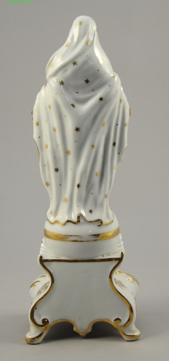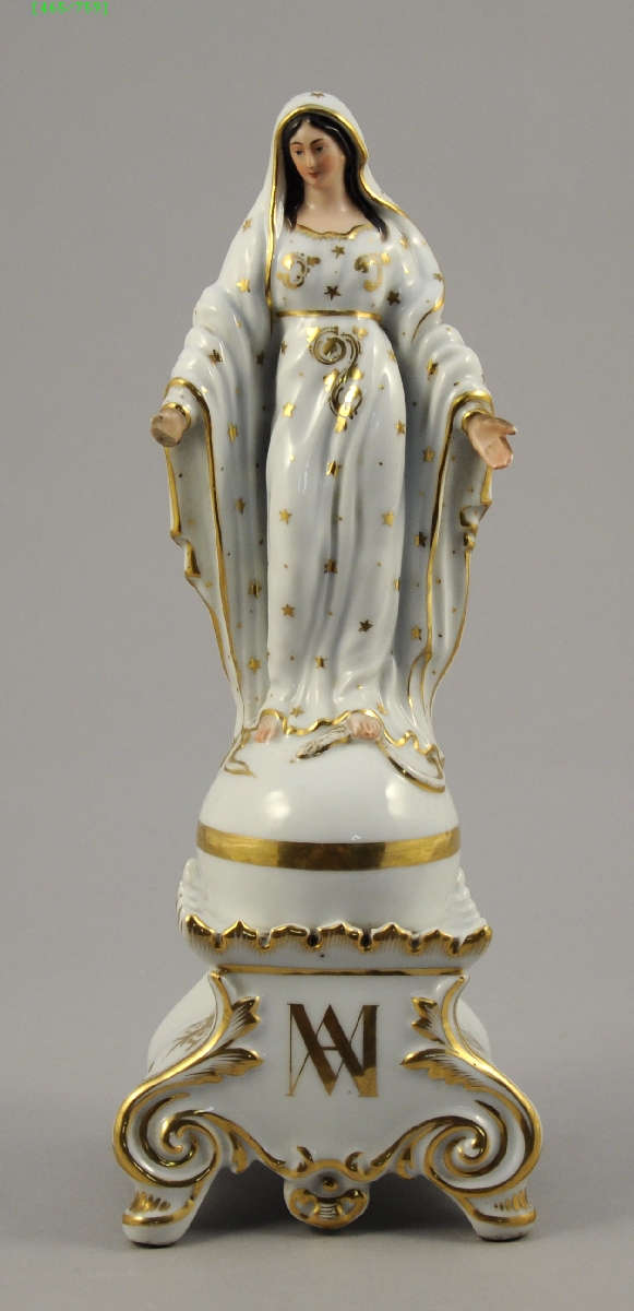 PARIS ou ANDENNE. Vierge en porcelaine blanche à rehauts dorés, sur un socle à piétement en volutes, marqué du "M" et du "A" entrelacés. Visage, mains et pieds rehaussés en polychromie.
