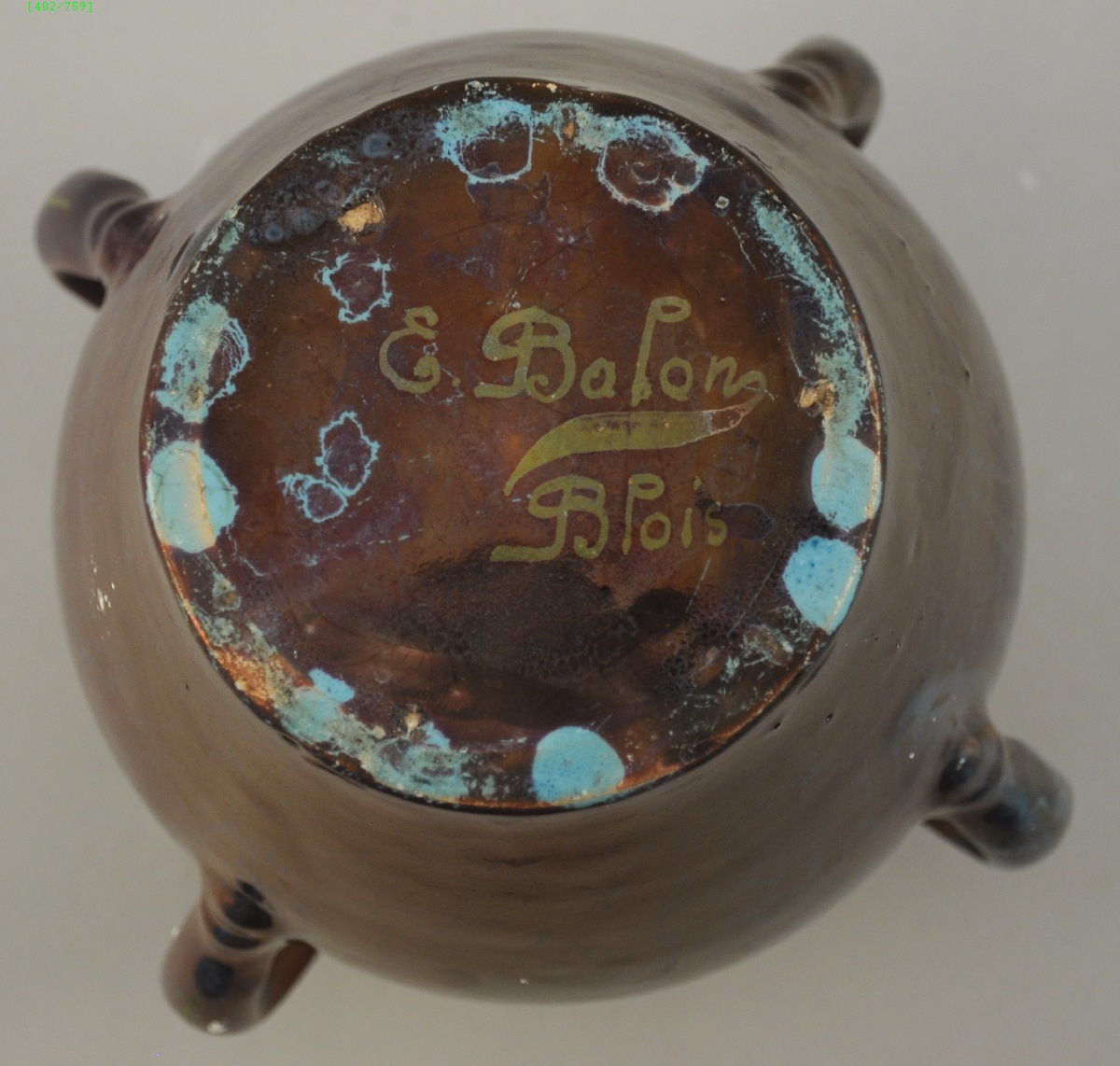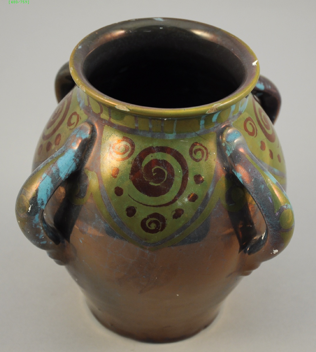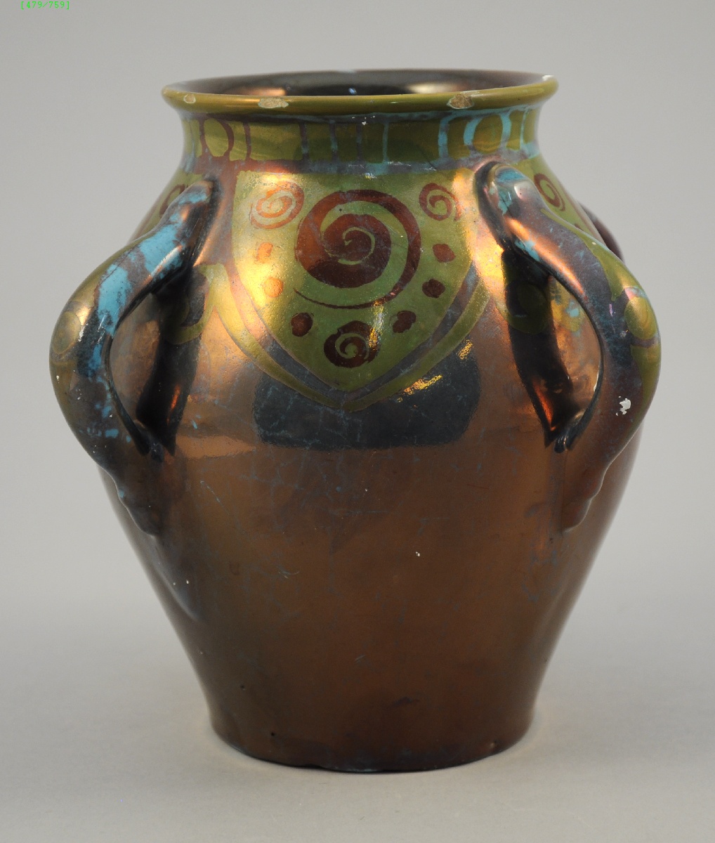 E. BALON, BLOIS. Vase balustre à quatre anses, à décor de lustre métallique. Signé sous la base.