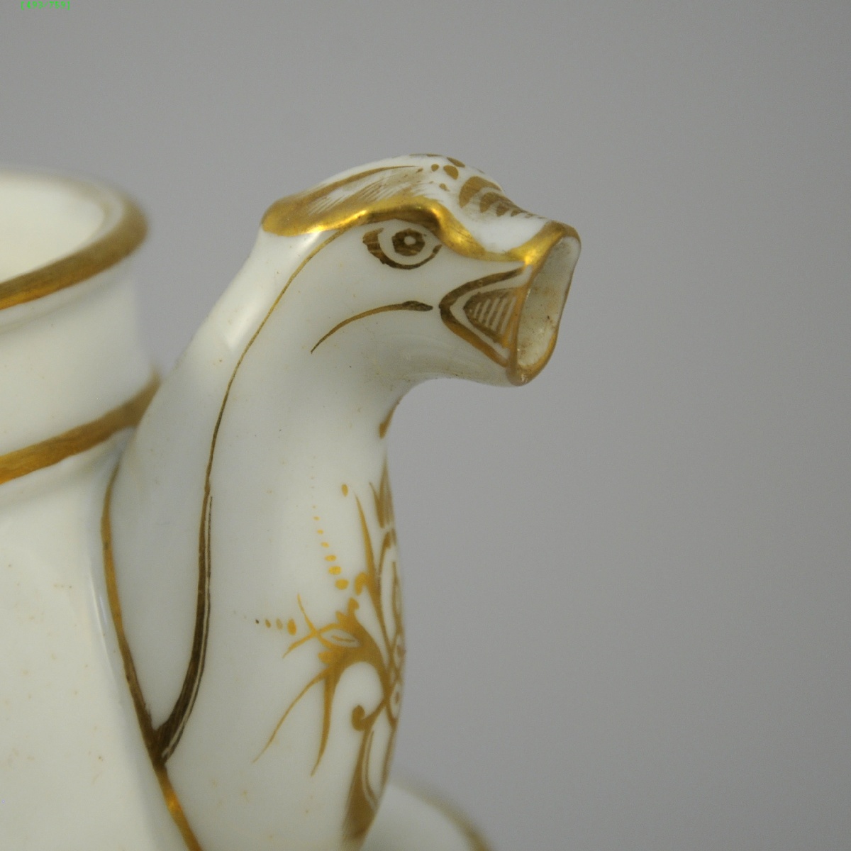 LIMOGES ou PARIS? TISANIÈRE en porcelaine. Anses feuillagées. Bec verseur zoomorphe. Elle porte sur le support et sur la verseuse la lettre B ornée d'entrelacs dorés.