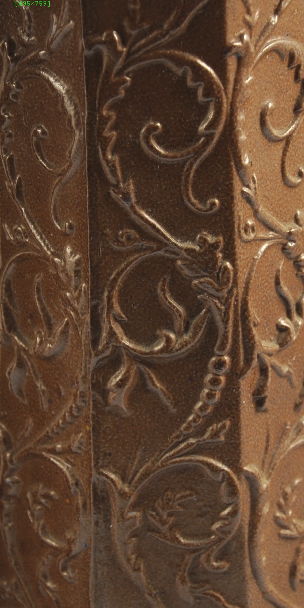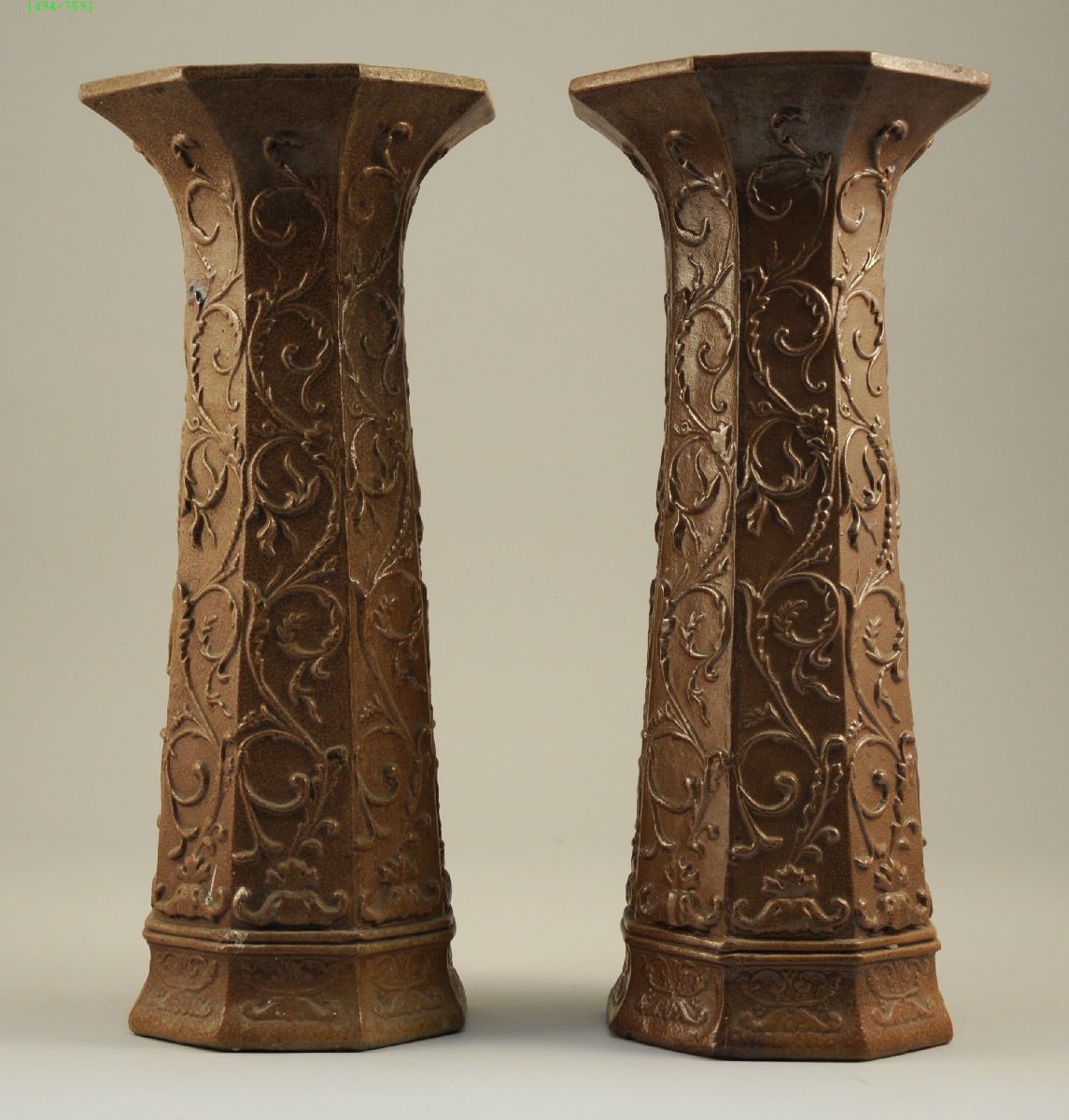 Paire de VASES cornets en grès octogonaux. Couverte tabac. Décor de rinceaux feuillagés.