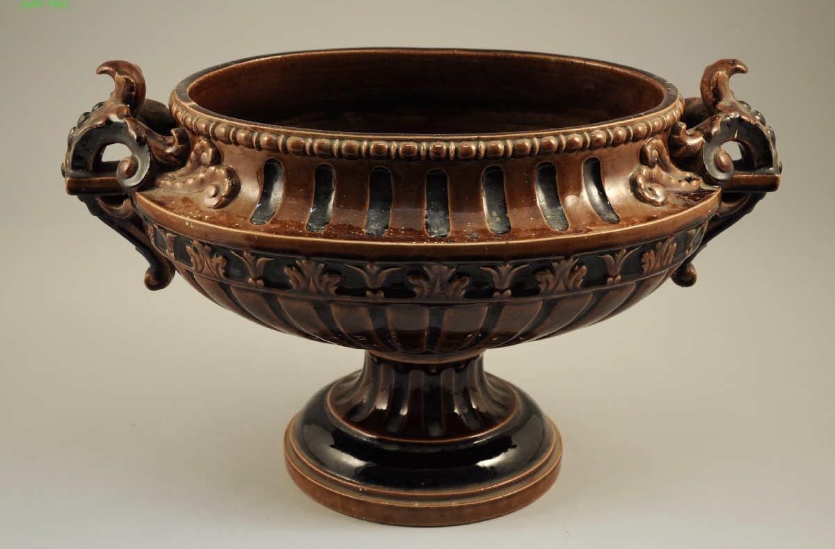 VASE d'ornement en faïence émaillée marron et noir, de forme oblongue. Décor de godrons, cannelures et palmes. Anses à motifs feuillagés. Piédouche rond cannelé.