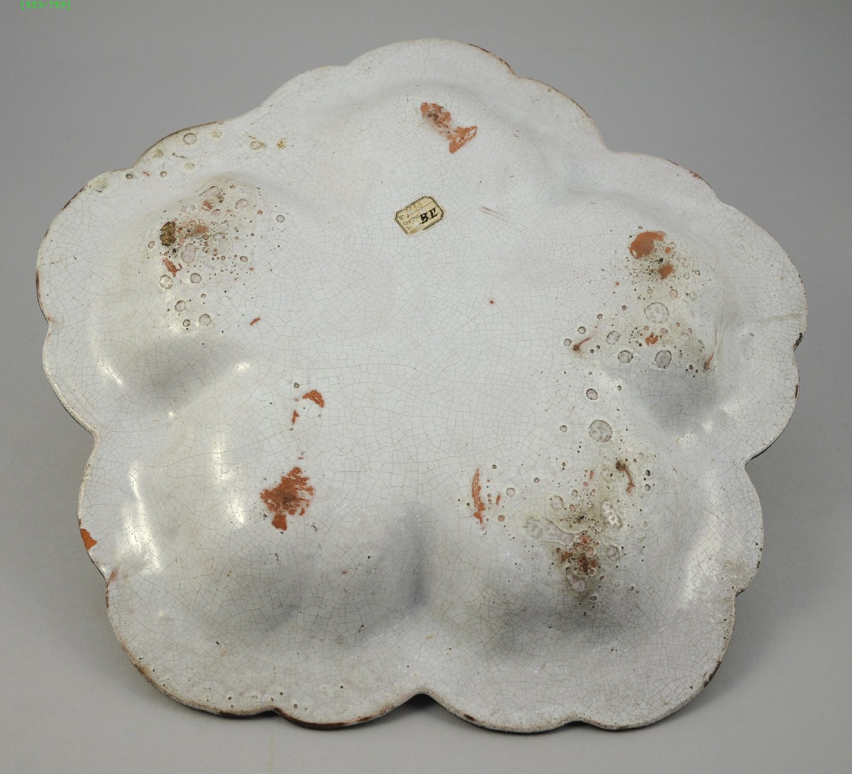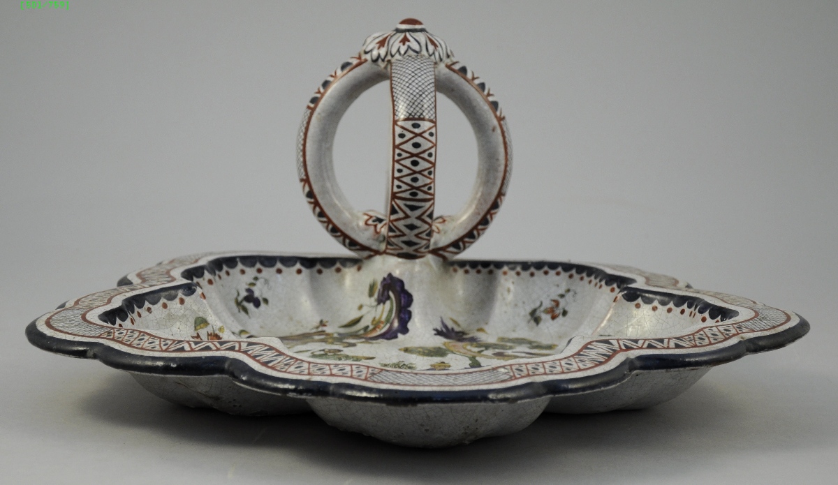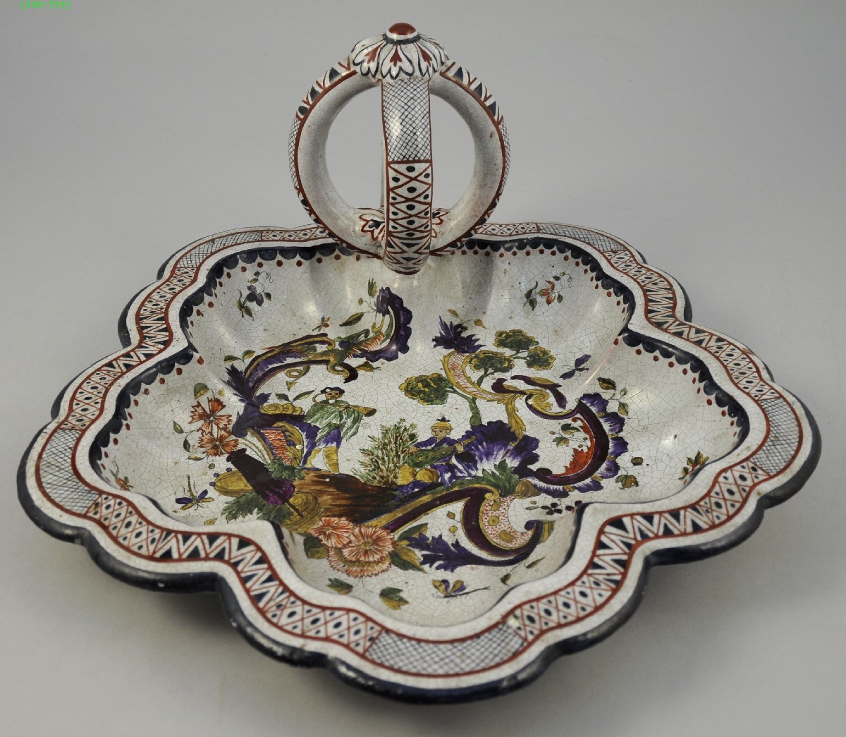 PLAT de service polylobé en faïence. Anse à quatre tiges réunies en forme de sphère. Décor polychrome de grand feu dans le goût de Rouen, figurant deux musiciens sur une terrasse à motifs rocailles, fleurs, insectes et animaux fantastiques. Motifs quadrillés bleus et rouges sur l'aile.