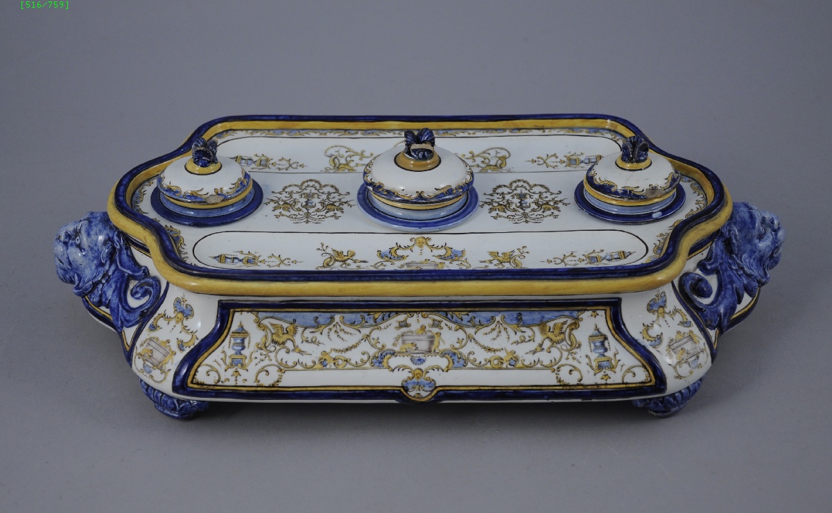 GIEN. ÉCRITOIRE en faïence fine, comportant deux repose-plumes et trois godets à couvercles. Profil en doucine, extrémités ornées de muffles de lions en relief, petits pieds décorés de feuillages. Motifs imprimés aux Amours vendangeurs, avec chimères et entrelacs.