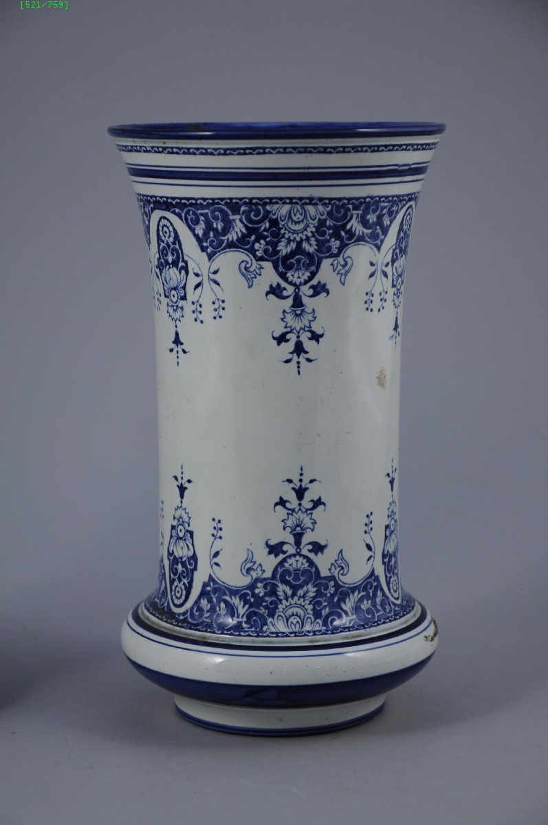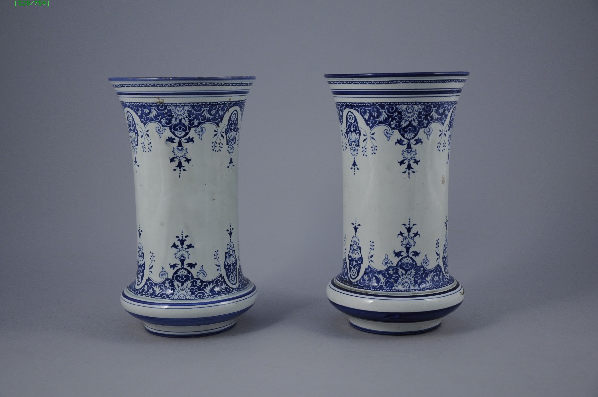 GIEN. Paire de VASES rouleaux en faïence fine, à décor imprimé en camaïeu bleu de lambrequins.