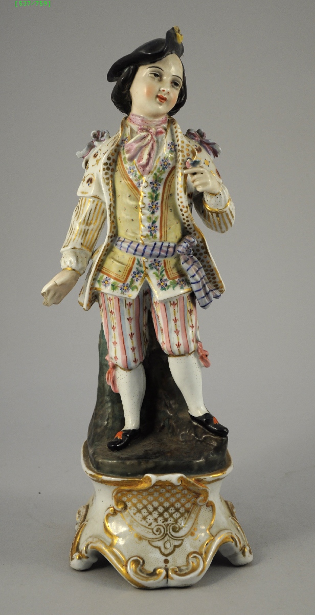 Deux SUJETS en porcelaine polychrome, figurant un couple de jeunes courtisans. La femme tient une cage ouverte ; l'oiseau qui y était enfermé s'est posé sur la main gauche de l'homme. Terrasses de porcelaine blanche à décor doré de croisillons et de volutes.