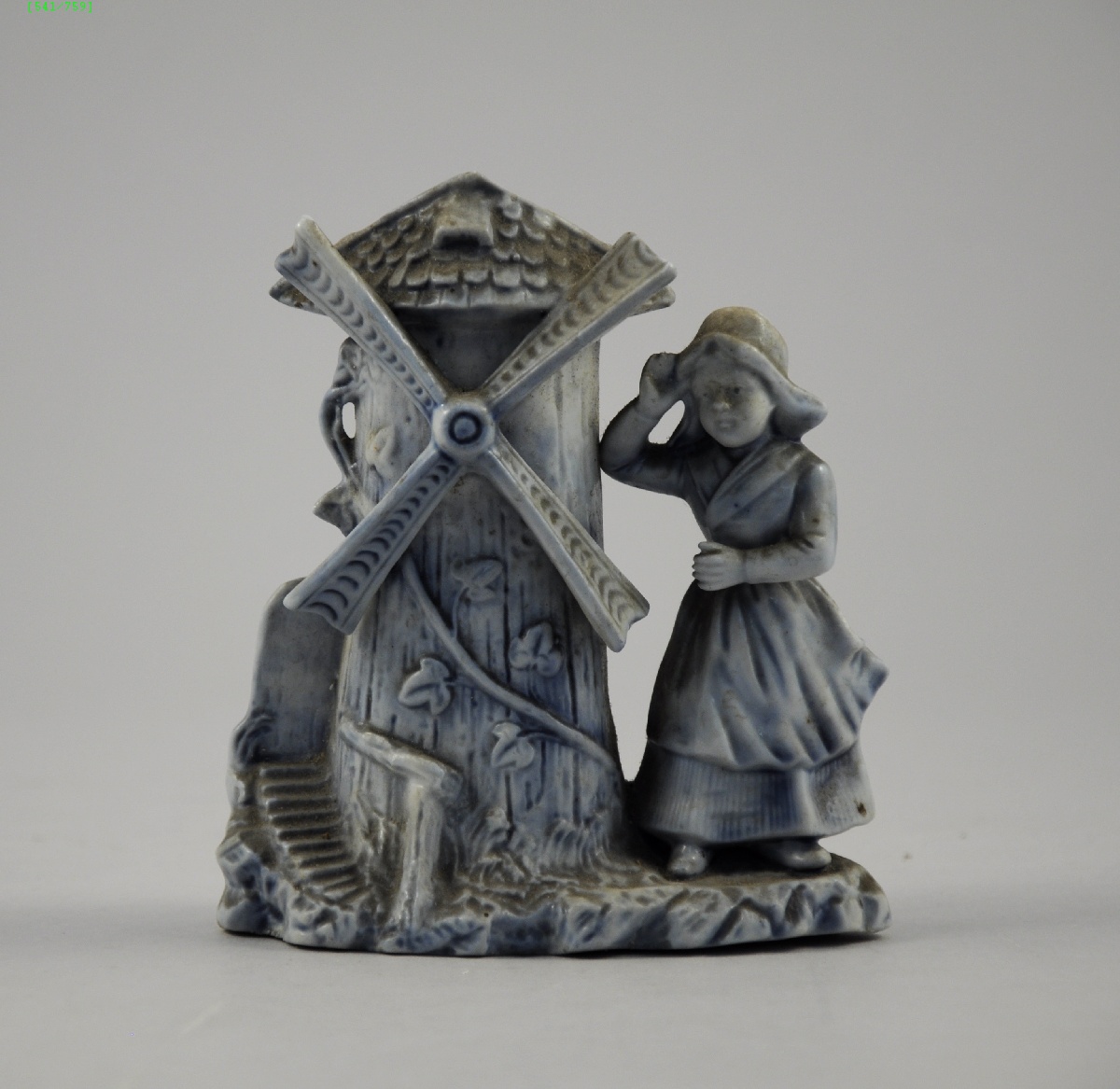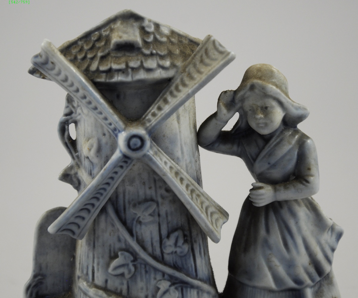 PORTE-BOUQUET en porcelaine blanche à rehauts bleus, figurant une fillette près d'un moulin.