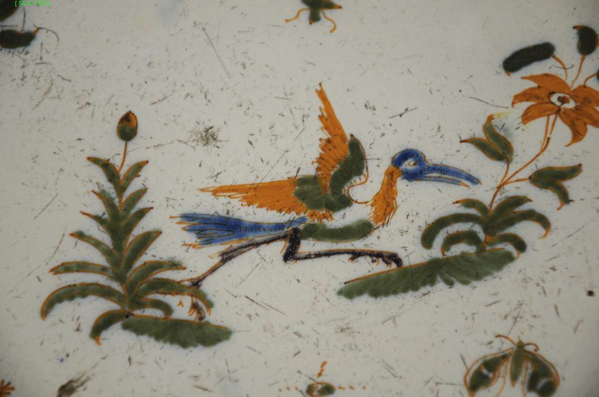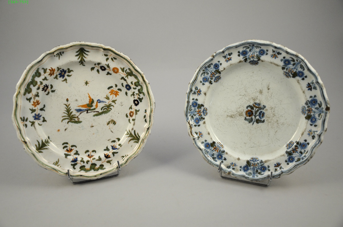 MOUSTIERS. Deux ASSIETTES à bords contournés en faïence stannifère à décor en polychromie de grand feu, pour l'une d'un échassier courant et de tiges fleuries, et pour l'autre de fleurs de solanées.