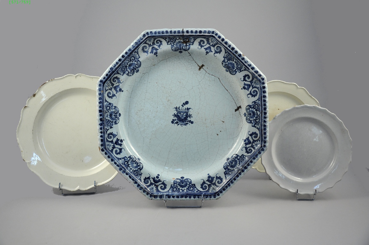 Joint: une assiette en faïence stannifère à bordure contournée, et une assiette et un plat rond à bordure contournée en faïence fine. XIXe. Diam. 22, 26 et 32 cm. (éclats)