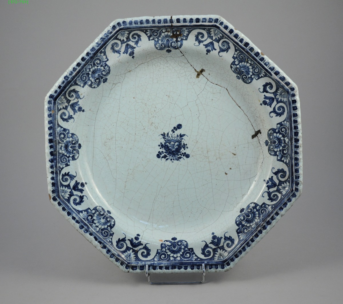 PLAT octogonal en faïence stannifère. Bordure à petits godrons. Décor en camaïeu bleu de grand feu d'une fleur au centre, et de broderies sur l'aile.