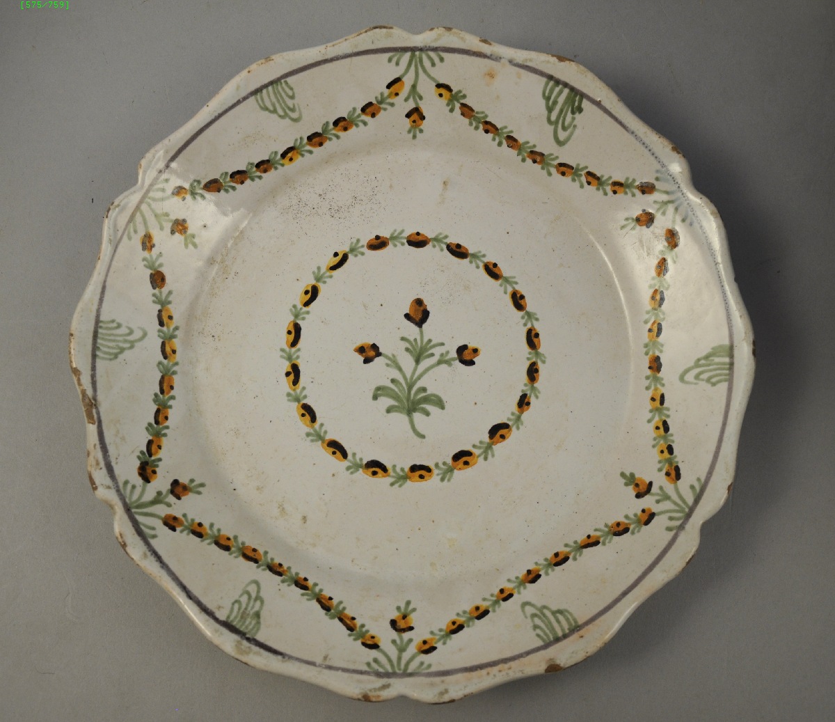 -ASSIETTE à bord contourné, décorée de guirlandes de fleurs. Probablement Nevers. Diam. 23 cm. (égrenures)