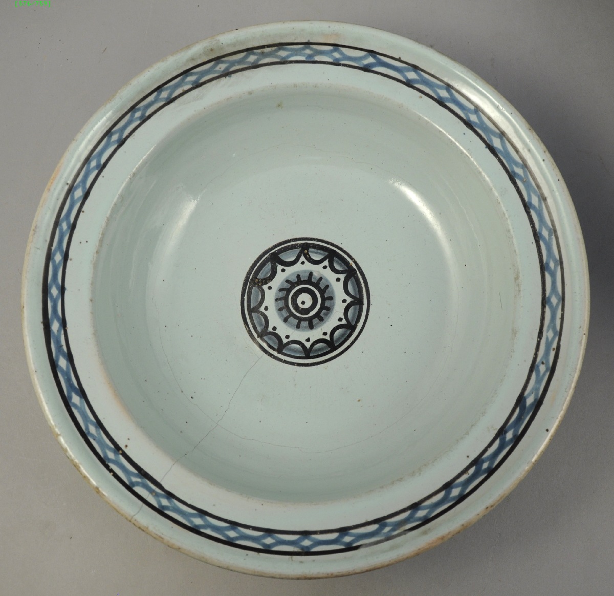 -PLAT ROND creux, dit "cul noir", à décor géométrique bleu et noir. Diam. 31 cm. (fêles)