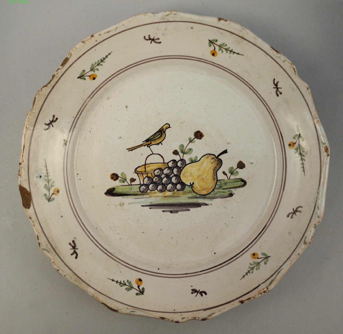 -ASSIETTE à bord contourné, décorée au centre d'un oiseau sur un panier, près d'une grappe de raisin et d'une poire, et sur le pourtour de semis de fleurs. Probablement Nevers. Diam. 22,5 cm. (un éclat sur l'aile)