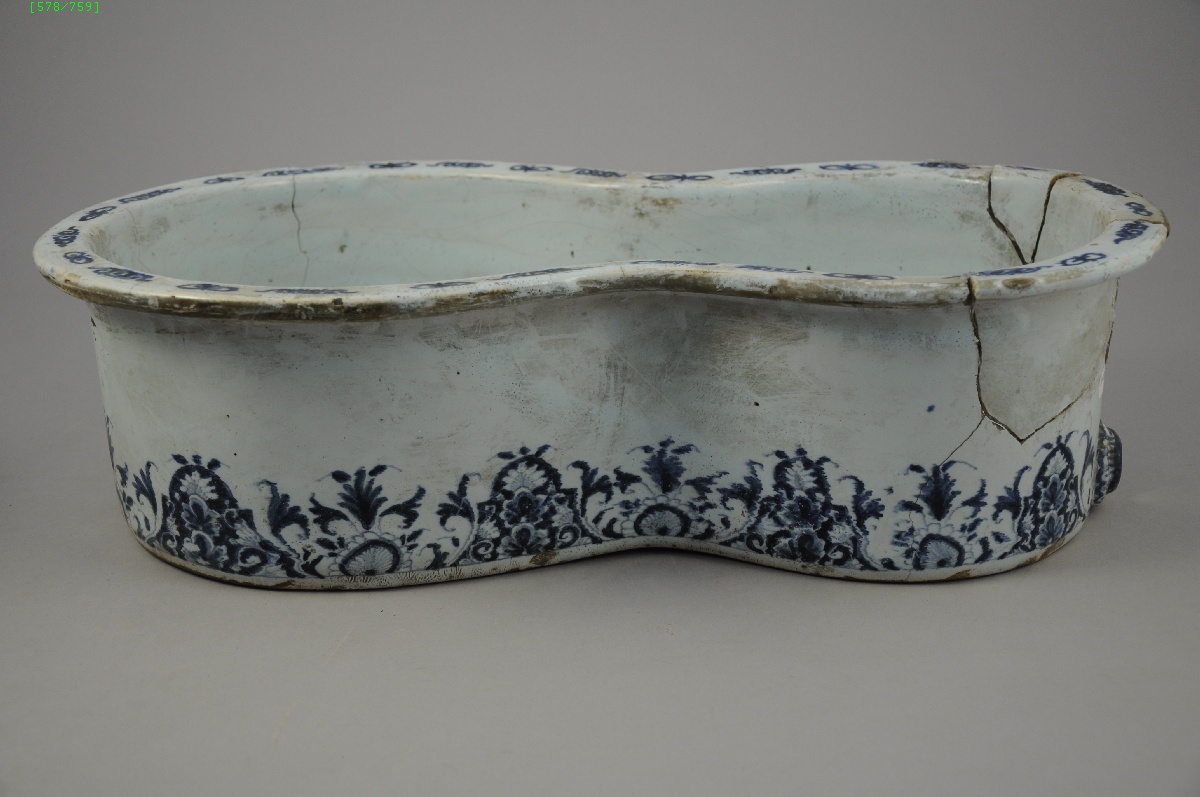 -BIDET à décor en camaïeu bleu de cobalt, à décor de fleurs, d'une coquille et de fleurs. Rouen. Haut. 13,5, Larg. 29, Long. 50 cm. (accidents, des éléments recollés)