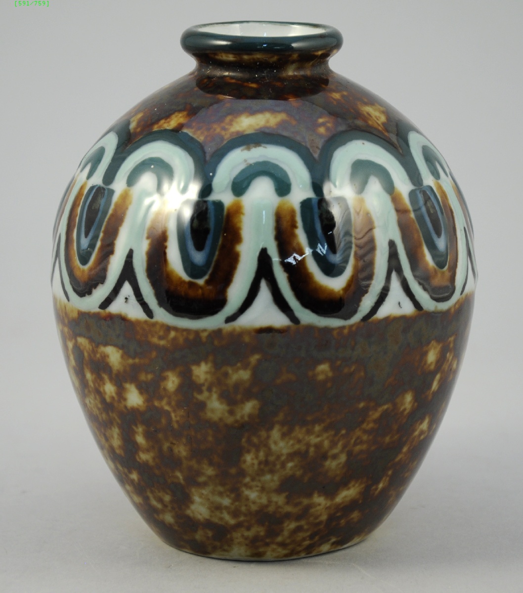 THARAUD à Limoges. Vase boule, à col circulaire annelé, réalisé en porcelaine de grand feu à décor géométrique émaillé polychrome sur fond brun.