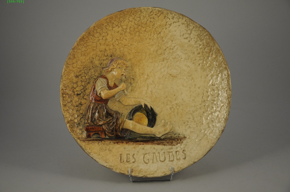 CLAUDET Max (1840-1893). Plat en terre cuite vernissé, représentant un jeune garçon assis sur un tabouret et léchant une cuillère. Titré "Les Gaudes", signé et daté (1886?).