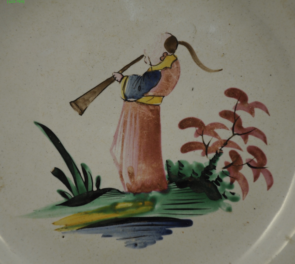 LES ISLETTES. Assiette en faïence stannifère à bordure contournée. Décor en polychromie de petit feu figurant un Chinois jouant de la trompe sur une terrasse.