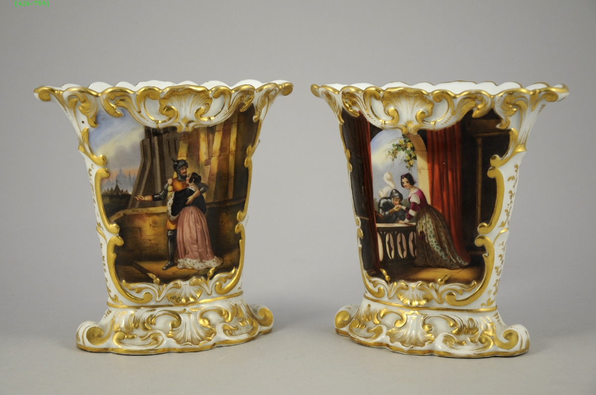 LIMOGES ou PARIS? Paire de vases en porcelaine. Décor en relief de coquilles et feuillages rehaussés à l'or. Ils sont ornés de scènes galantes d'esprit troubadour, représentant un chevalier et sa dame, en haut de remparts et au balcon d'un château. De l'autre côté sont représentés des paysages lacustres.