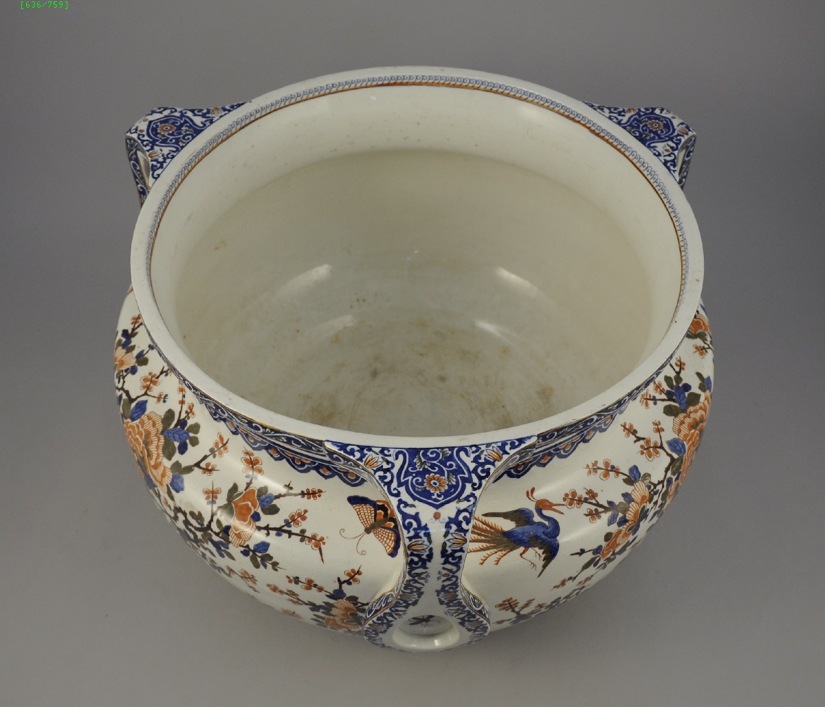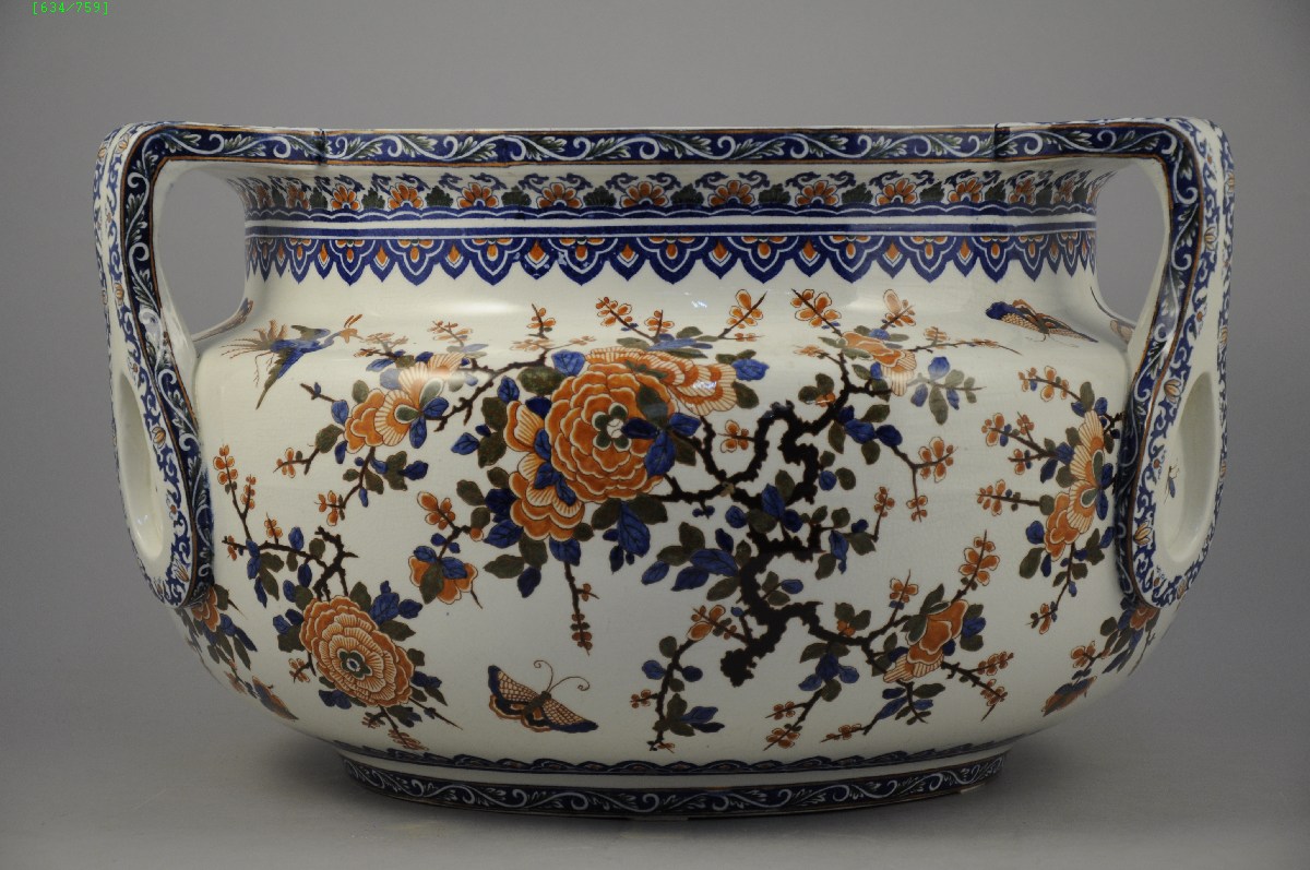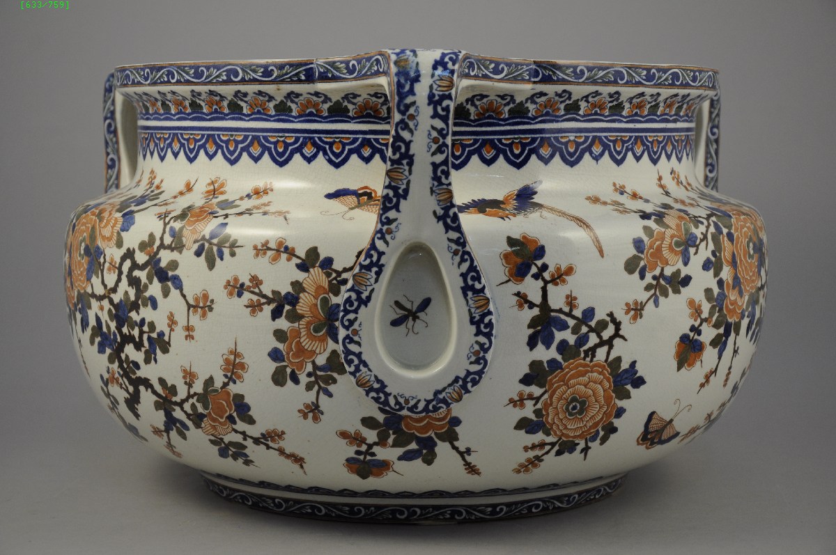 GIEN. Grand CACHE-POT circulaire à trois anses, en faïence à décors d'oiseaux, de papillons et d'insectes dans le goût de Delft. Signatures du décorateur bleue "A" et jaune "29".