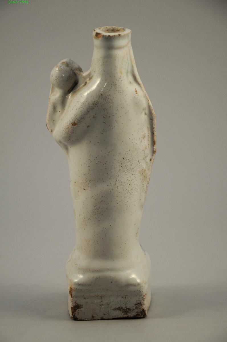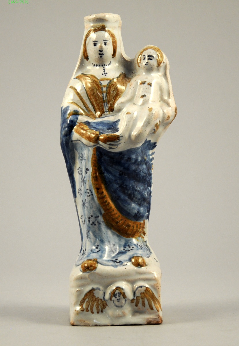 VIERGE D'ACCOUCHÉE en faïence stannifère à décor bleu et ocre de grand feu.