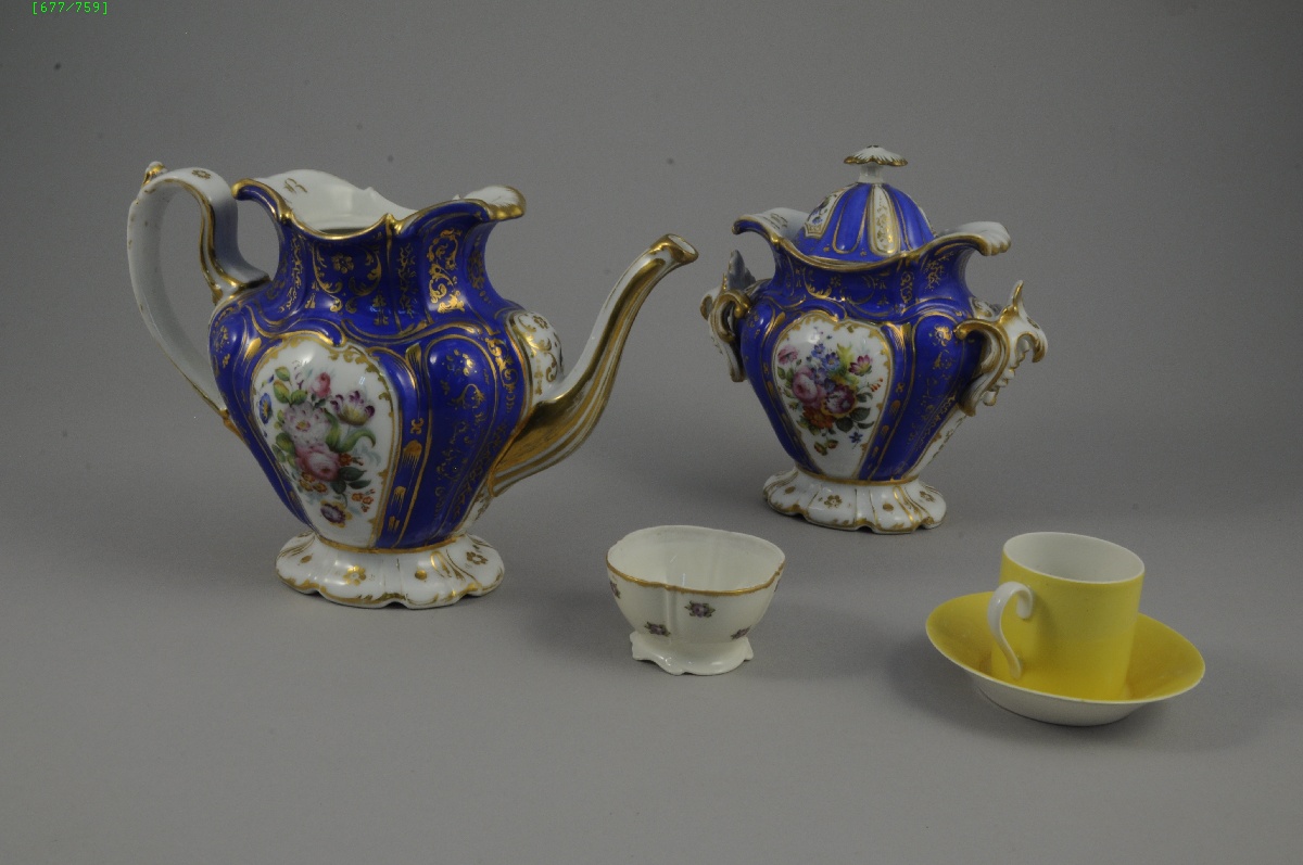 Haut: Sucrier: 18 cm, Théière: 17 cm. (manque le couvercle de la théière, usures à la dorure)