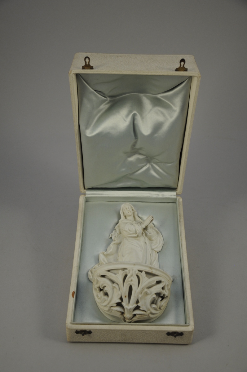 BÉNITIER en biscuit de porcelaine, figurant l'Immaculée Conception sur le croissant de lune. Récipient à décor ajouré de palmes. Marque au dos: V couronné. Dans un coffret garni de tissu blanc.