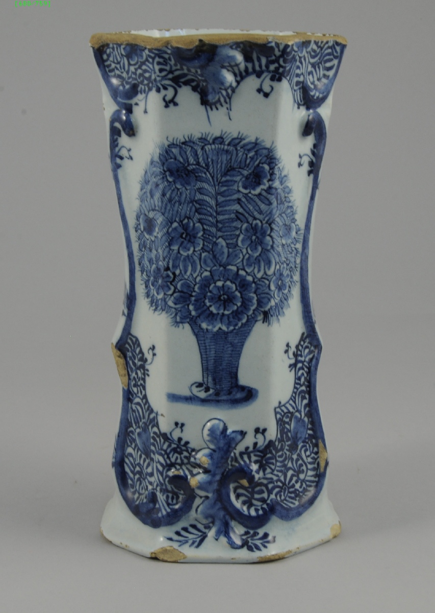 DELFT. Vase cornet à décor d'un bouquet fleuri dans un encadrement de volutes en relief. Porte une signature: manufacture de l'A grec?