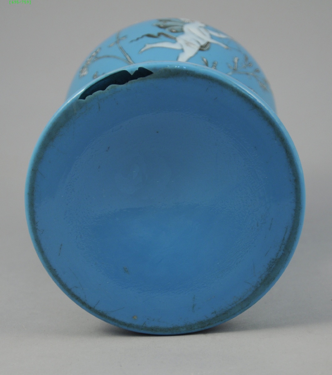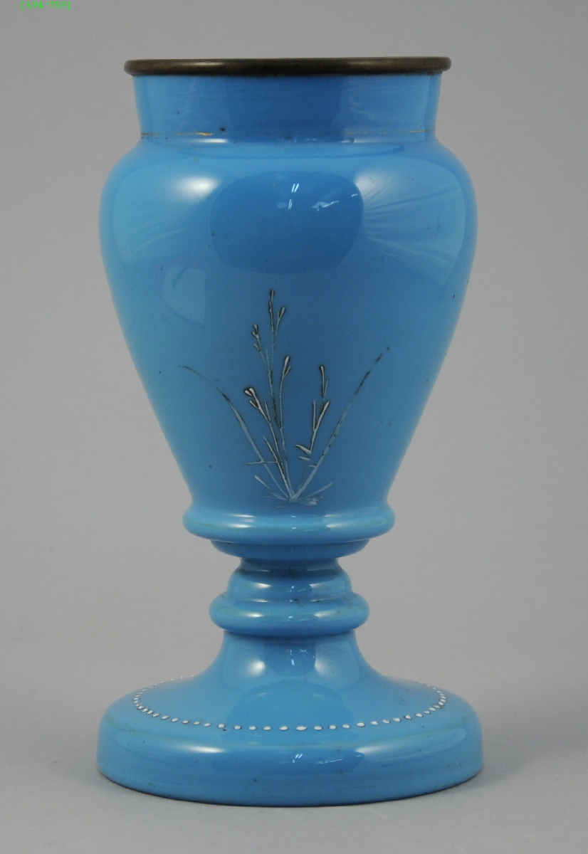 VASE balustre en opaline, reposant sur un large piédouche. Décor en émail blanc d'un Amour volant entre des tiges fleuries. Bordure protégée par un cerclage de laiton.