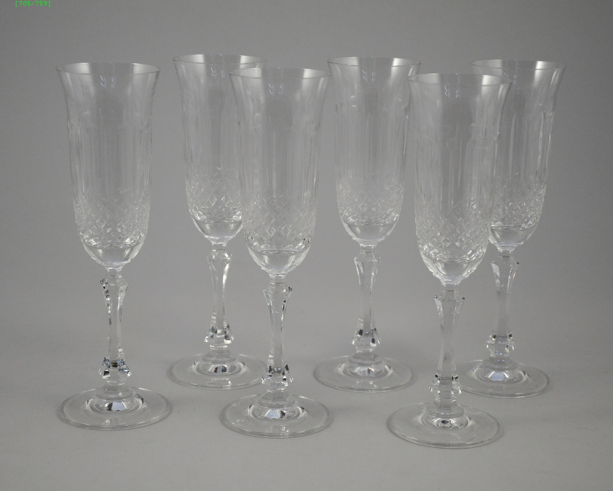 ARTISANAT DE LORRAINE. Six flûtes à Champagne en cristal taillé en facettes et à croisillons, dans leur coffret.