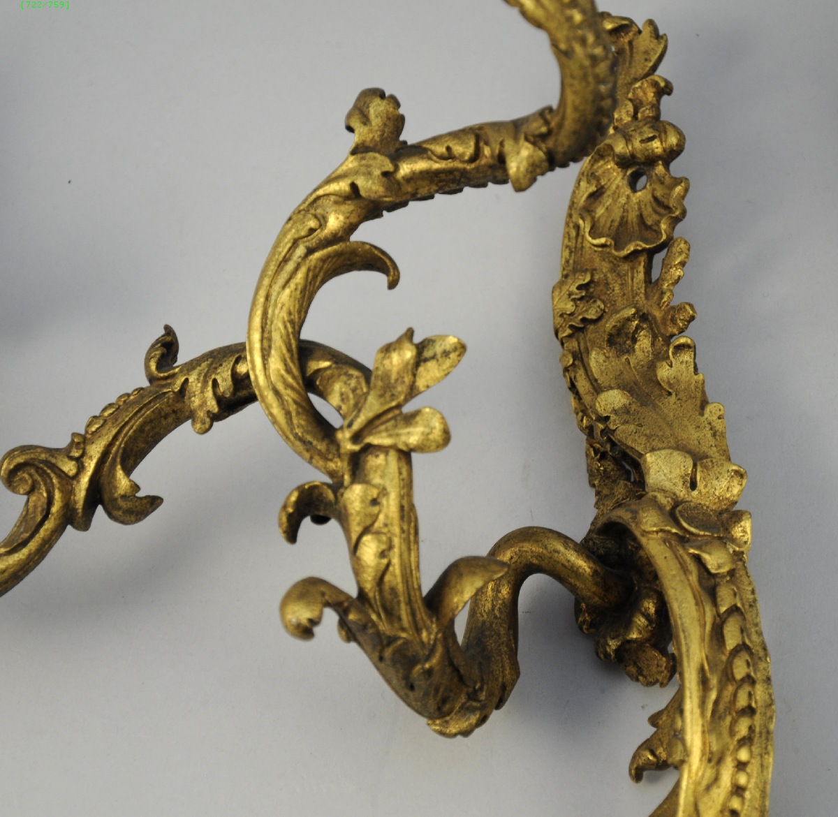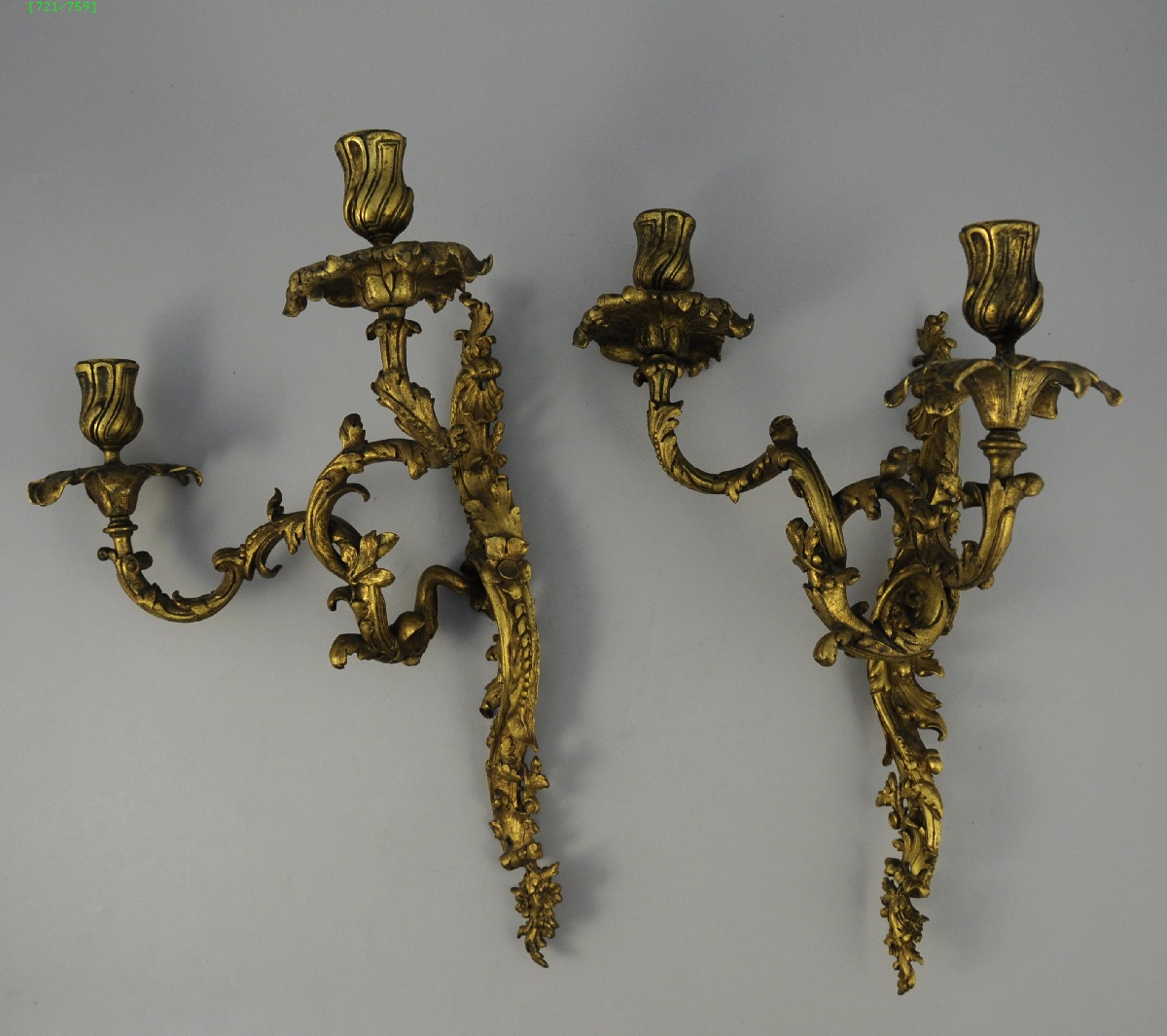 Paire d'APPLIQUES en bronze ciselé et doré, à deux lumières. Décor rocaille de palmes, branches de chêne et coquilles.