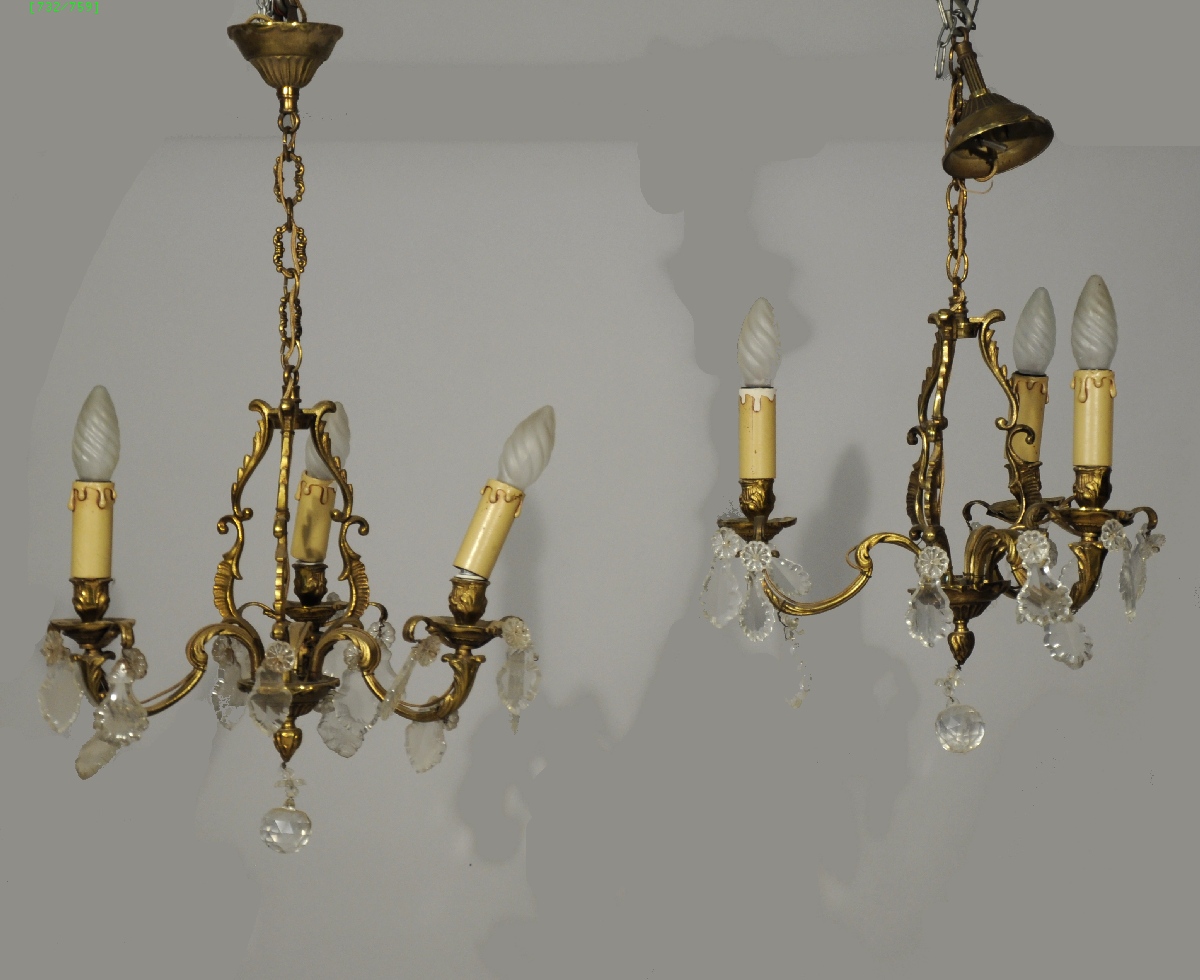 Paire de LUSTRES en bronze doré et pampilles de verre à trois feux électrifiés. XXe.